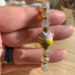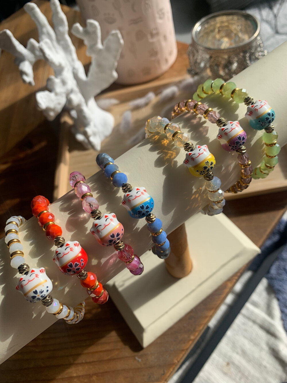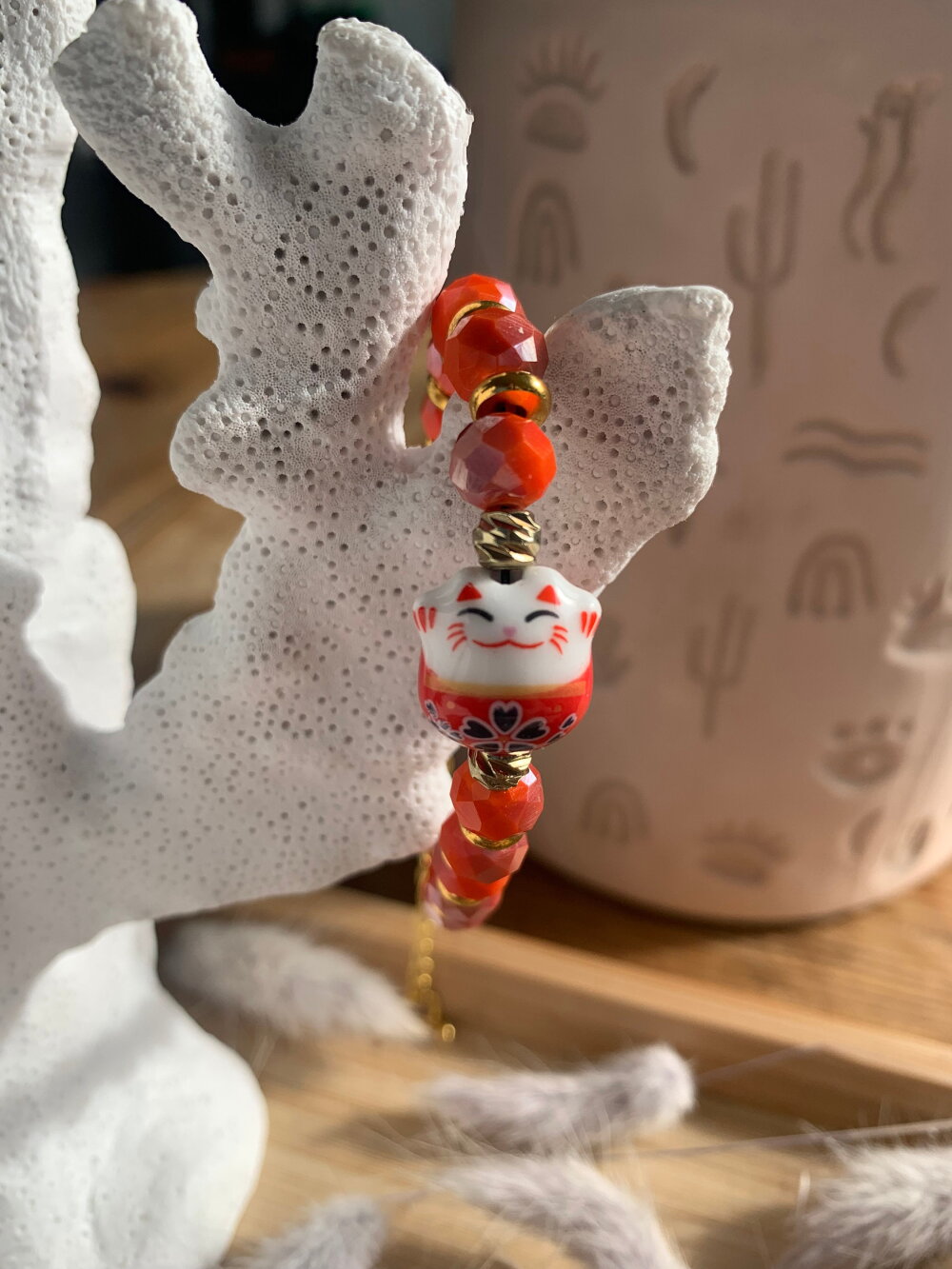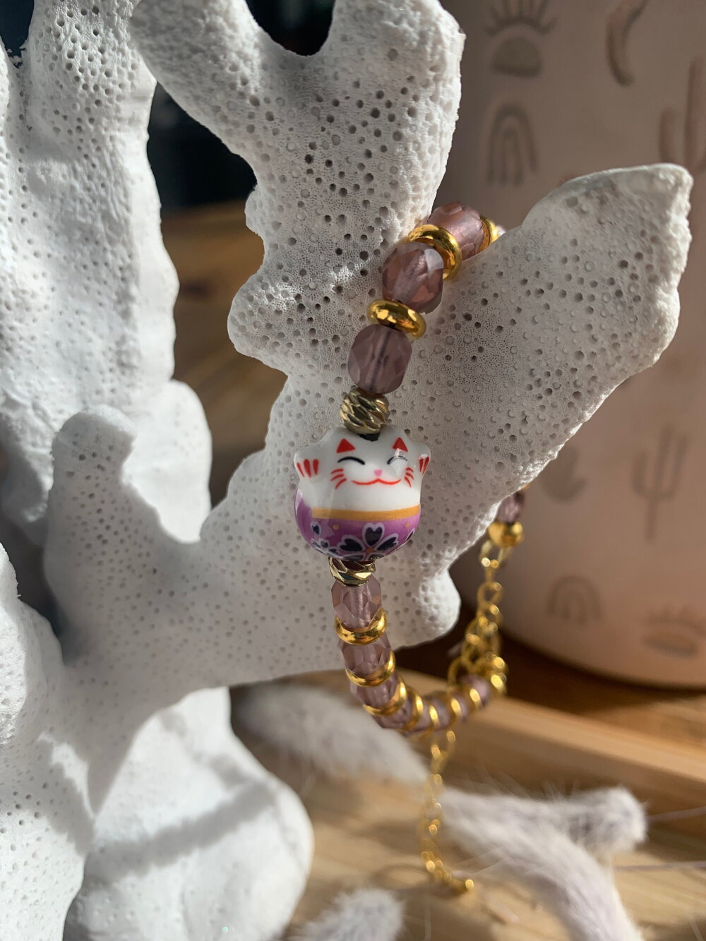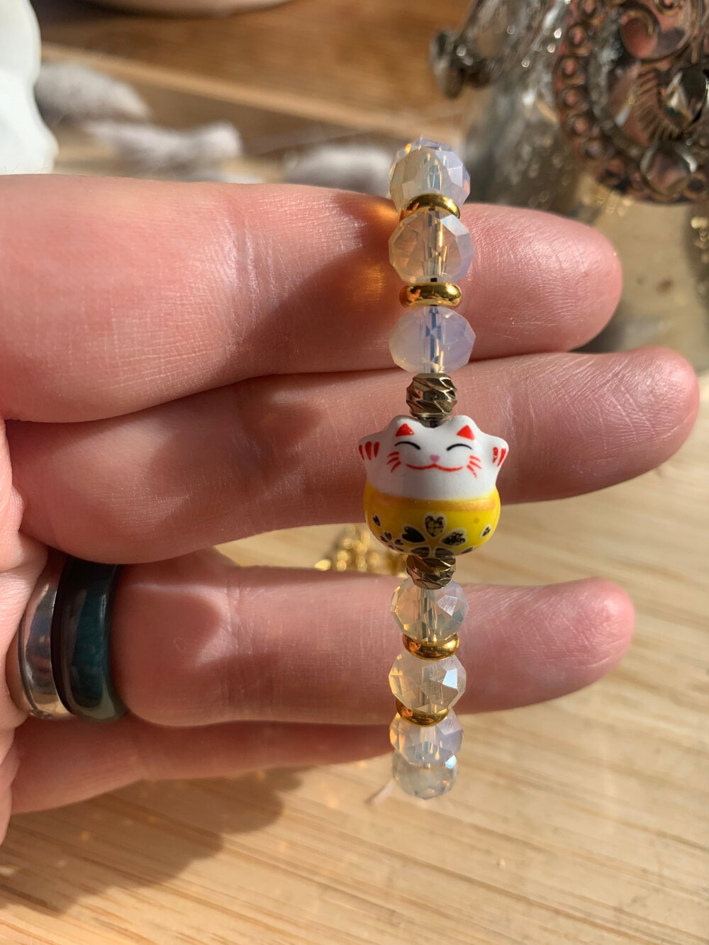 Bracelet porte bonheur chat Chinois, composé de perles en cristal de Bohème, de séparateur en métal doré inoxydable, et en pièce principale un chat Chinois en porcelaine.