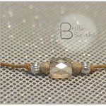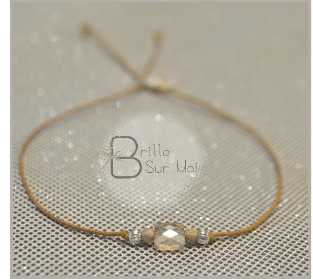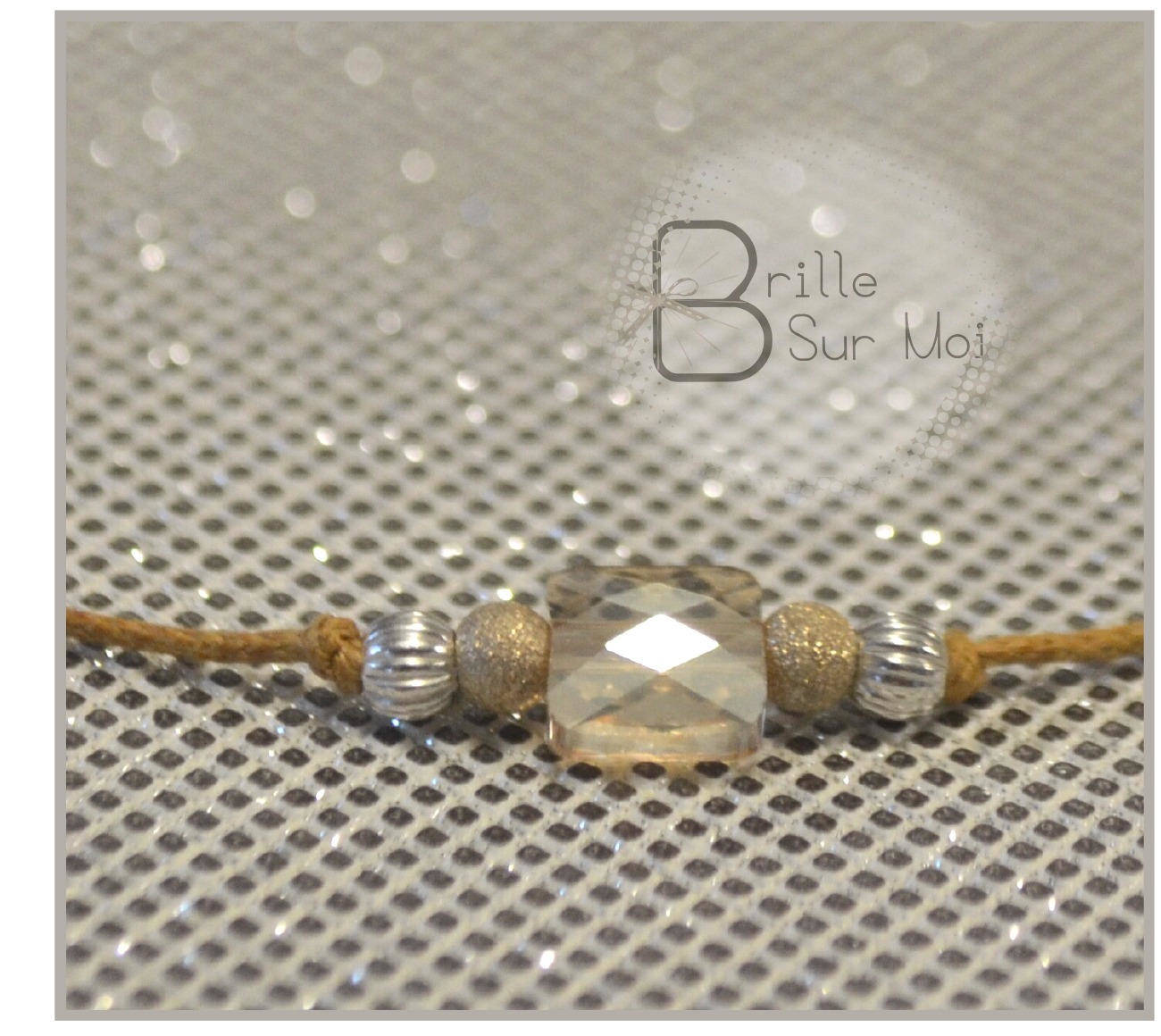 Petites perles montées sur un lien fin en coton ciré dont 2 perles en Argent 925/1000, 2 perles en Gold filled 14k et 1 perle carré plate de 6mm à facettes en cristal swarovski.