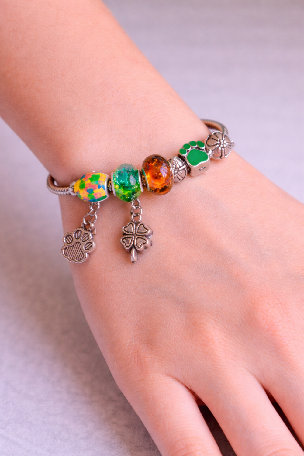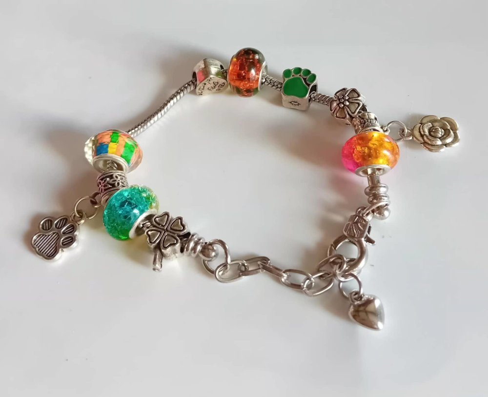 Apportez une touche de couleur et de personnalité à votre poignet avec ce bracelet dynamique et joyeux. Ce bijou combine des perles en verre éclatantes et des charms thématiques pour un look à la fois moderne et fantaisie.