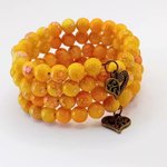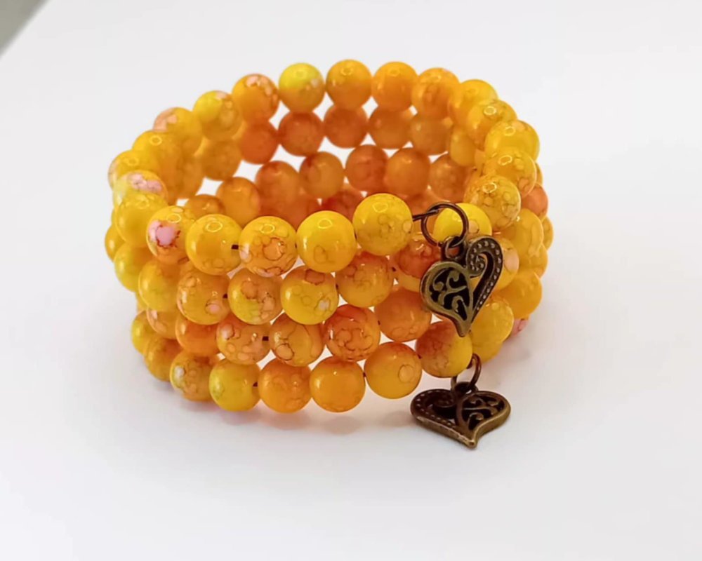 Ce bracelet est monté sur fil mémoire couleur bronze qui s’enroule en plusieurs tours pour un volume structuré sans effort. Les perles de verre orange vibrant de 8 mm apportent une énergie vitaminée et chaleureuse, tandis que les breloques cœurs ajoutent une touche de douceur et de féminité.