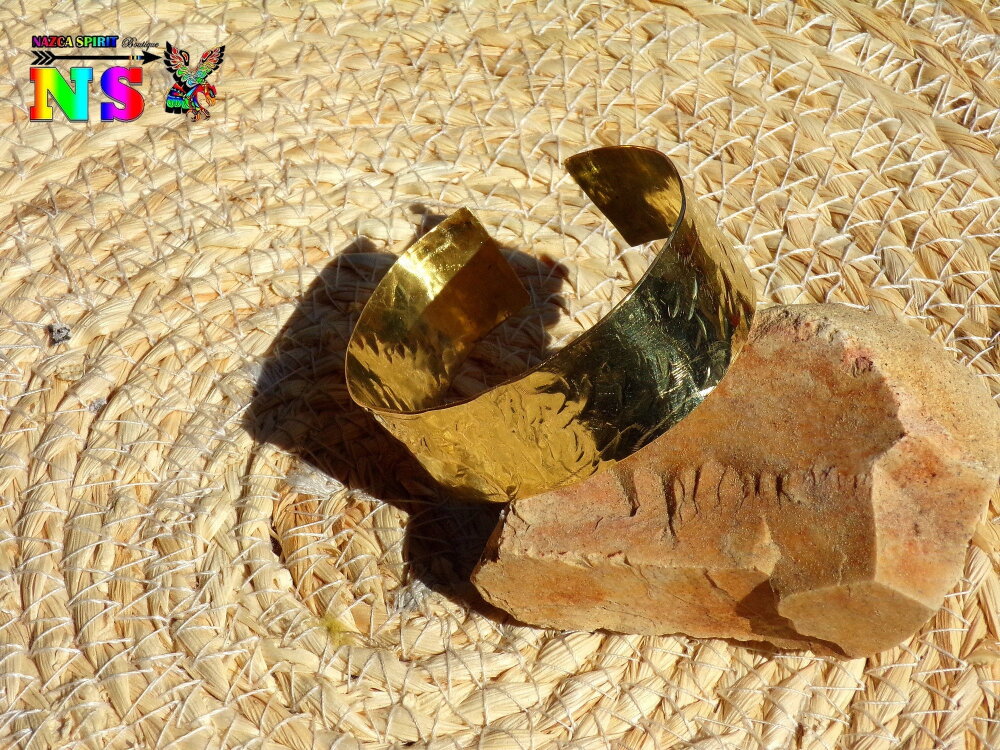 J'ai découpé une bande de laiton de 2.3 cm de large que j'ai façonné puis martelé à la main à l'aide d'un marteau conçu pour le martelage et d'une enclume à bijoux.
