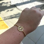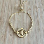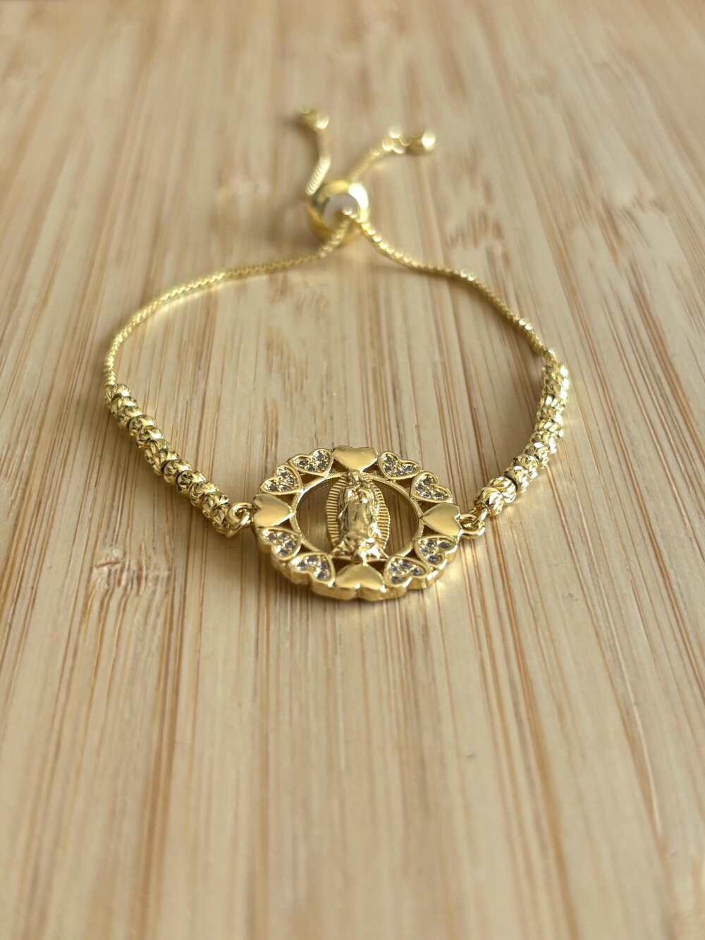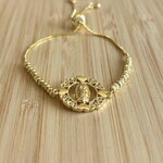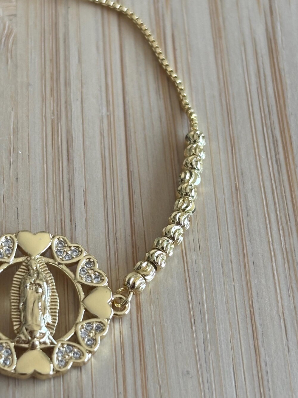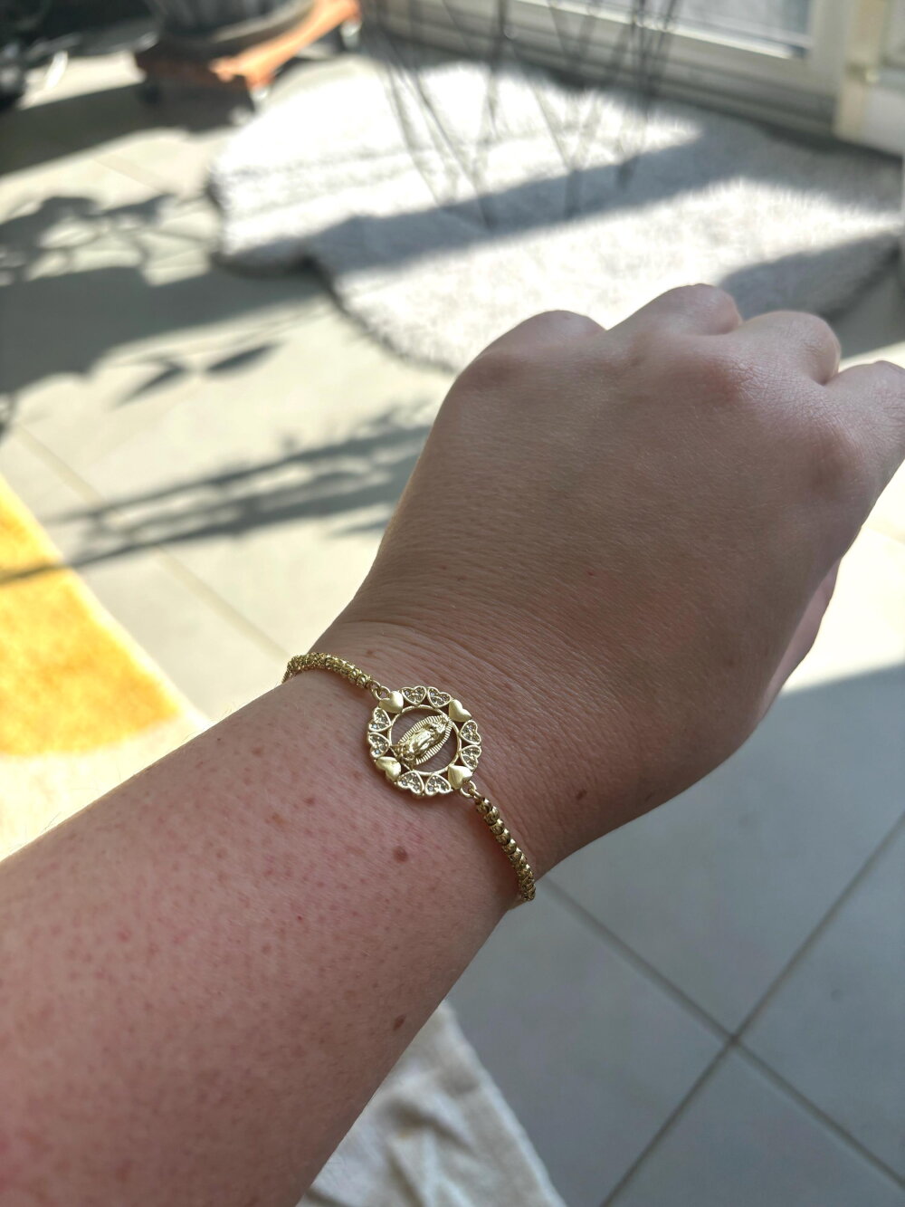Ajoutez une touche de spiritualité et d’élégance à votre poignet avec ce bracelet raffiné en acier inoxydable doré, représentant la Vierge Marie entourée de cœurs délicats.
