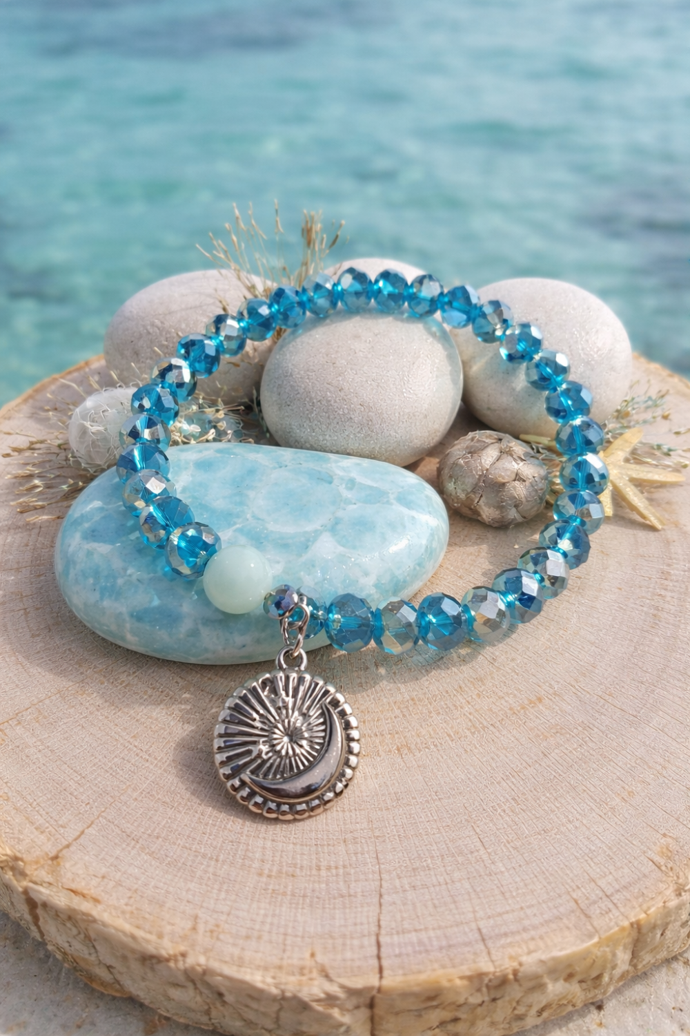 Sa composition unique marie l'élégance de perles bleues scintillantes, rappelant un ciel nocturne étoilé, à la douceur de l'amazonite et au symbolisme puissant de la lune.