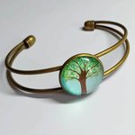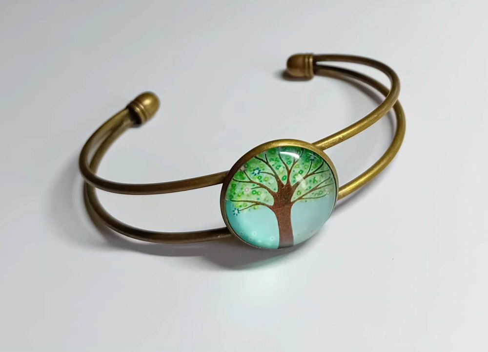 Bracelet jonc arbre de vie – Bracelet bohème doré ajustable – Bijou nature cabochon verre – Cadeau femme symbolique.