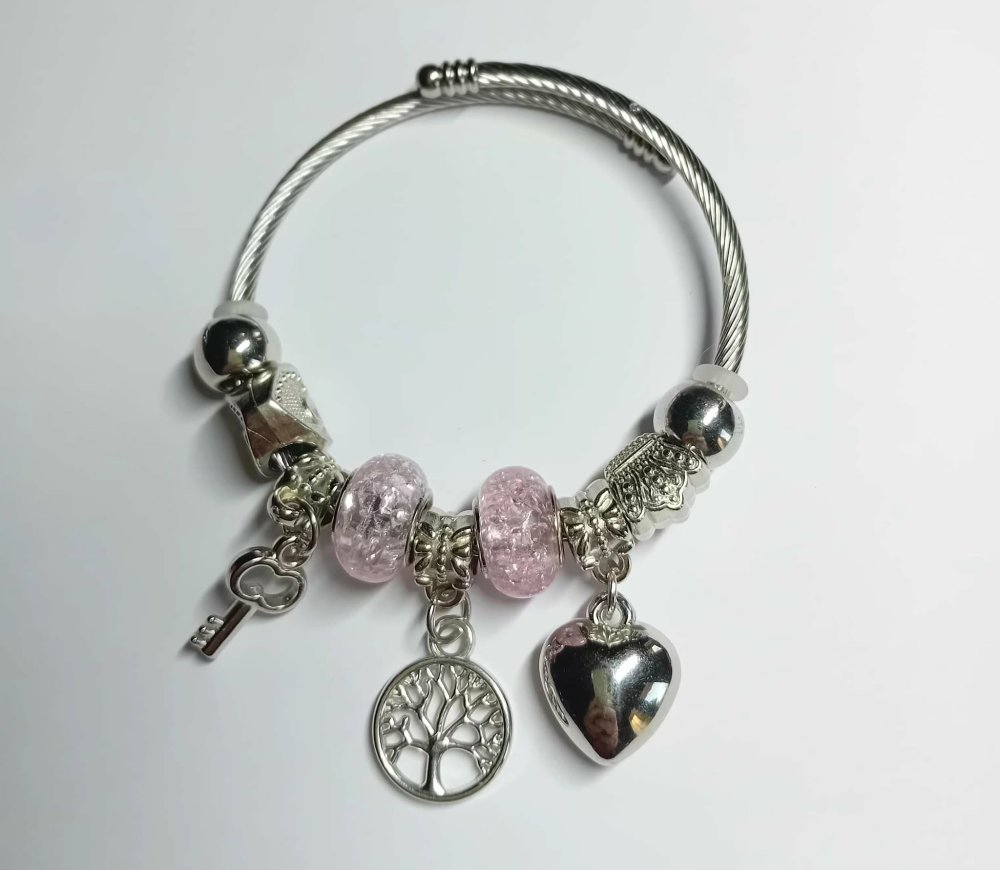 Perles roses aux nuances tendres et chams/breloques assortis.