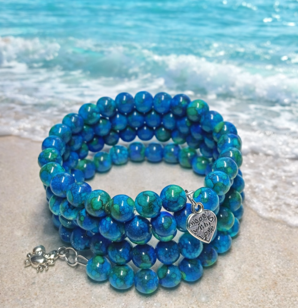 Perles : Perles de verre marbrées offrant un magnifique camaïeu de bleu lagon, bleu roi et des touches de vert.
