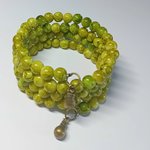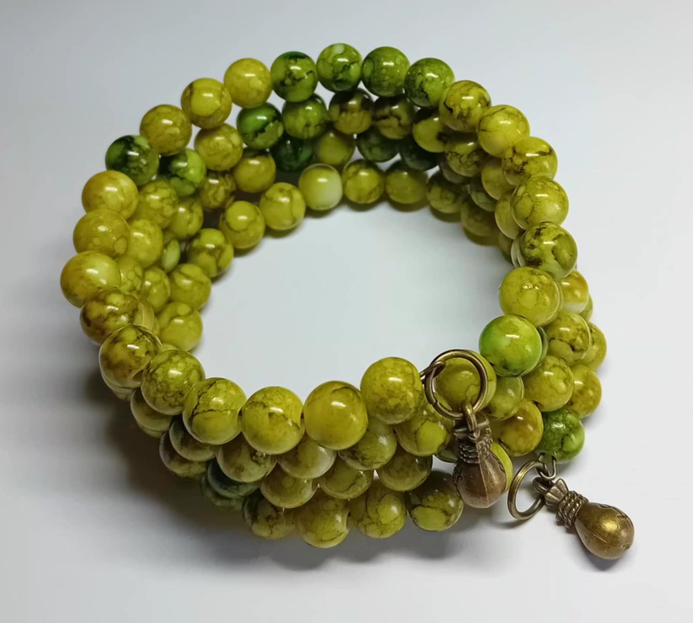 Composé de perles en verre vertes de 8 mm, accompagnées de breloques assorties.
