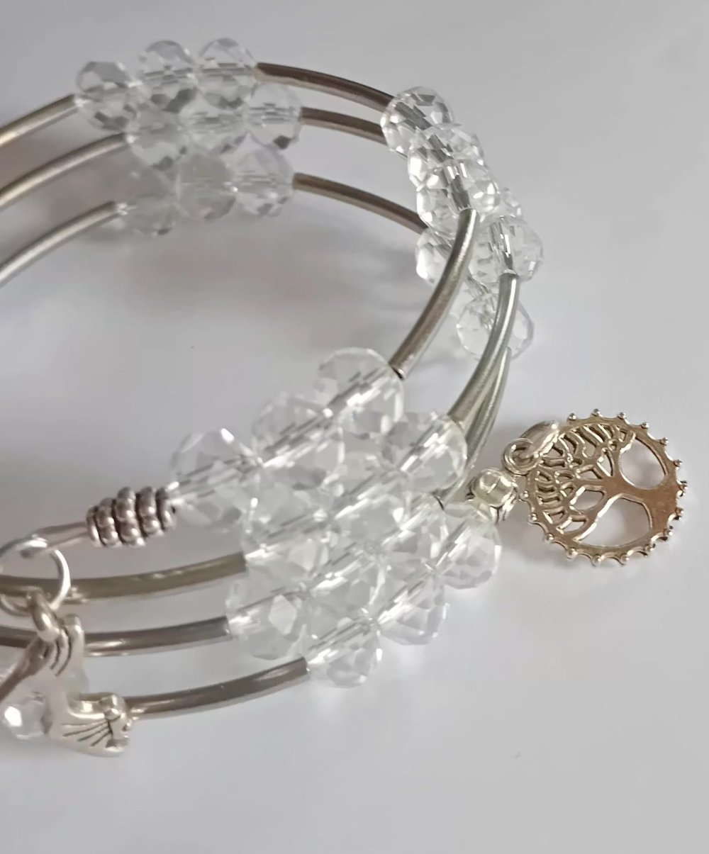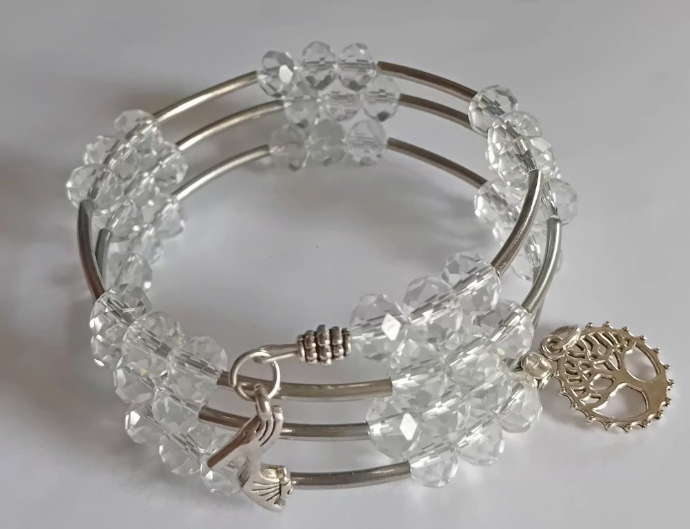 Composé de perles de cristal transparentes de 8 mm, accompagnées de breloques assorties.