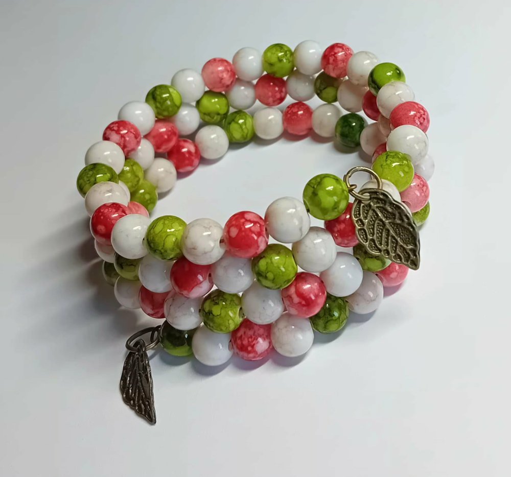 Un bracelet multi‑rangs en perles rondes marbrées, mêlant harmonieusement trois teintes douces et vibrantes :
