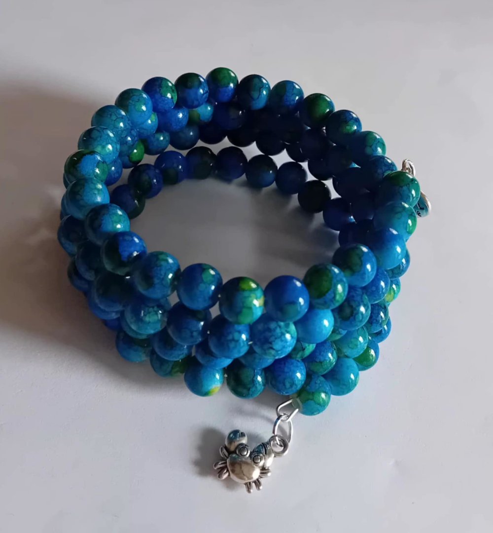 Perles : Perles de verre marbrées (8 mm) dans un magnifique camaïeu de bleu lagon, bleu roi et touches de vert.