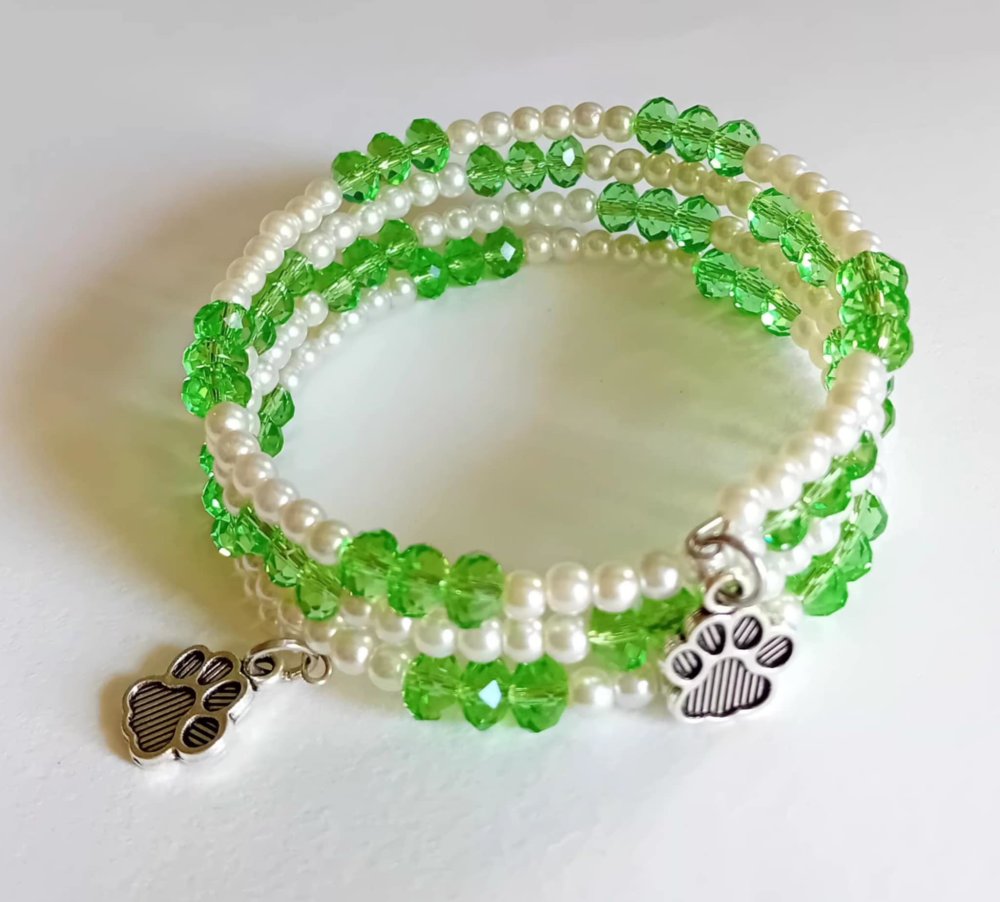 Composé de perles facettées vert émeraude et de perles blanches nacrées, il s’adapte naturellement au poignet grâce à sa structure en spirale. Deux charms en forme de pattes de chien apportent une touche tendre et personnalisée, idéale pour les amoureux des animaux.