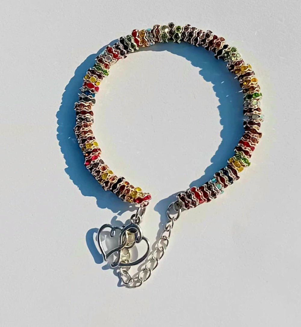 Bracelet vibrant aux perles ondulées multicolores, sublimé par un pendentif cœurs argentés. Une création joyeuse et pleine de tendresse, idéale pour illuminer le poignet.