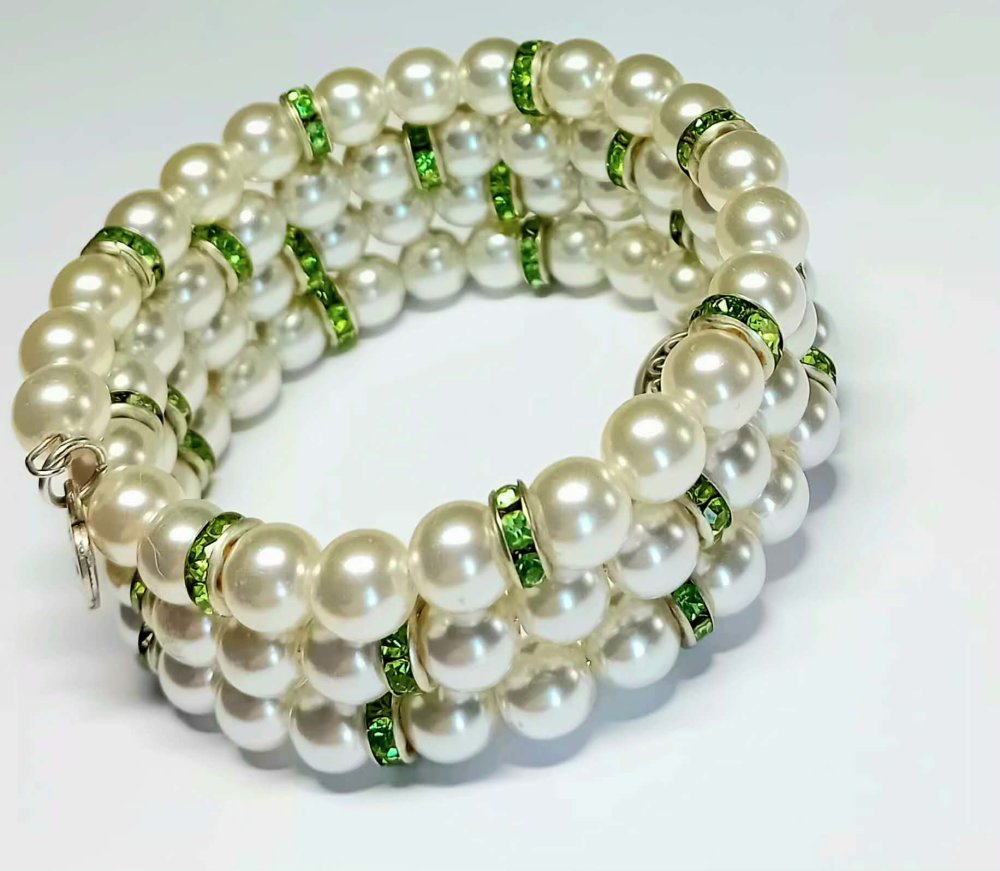 pportez une touche de délicatesse à votre style avec ce bracelet multi-rangs en perles blanches lumineuses. Son design travaillé en volume sublime le poignet, tandis que les intercalaires ornés de cristaux verts captent la lumière avec subtilité. Inspiré par la nature, ce bijou évoque la fraîcheur d’un jardin fleuri et la légèreté des papillons.