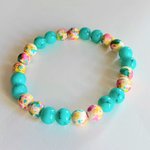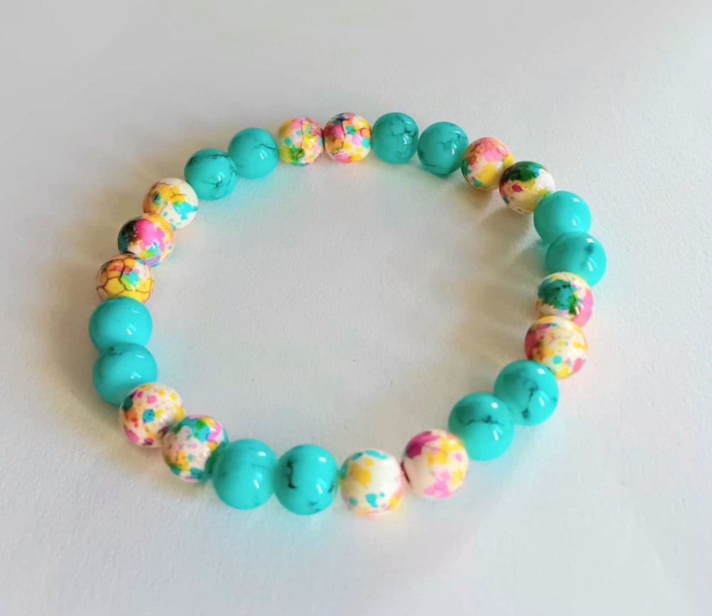 Ce bracelet associe la fraîcheur du turquoise à la gaieté des perles multicolores marbrées pour créer un bijou lumineux et plein de personnalité.