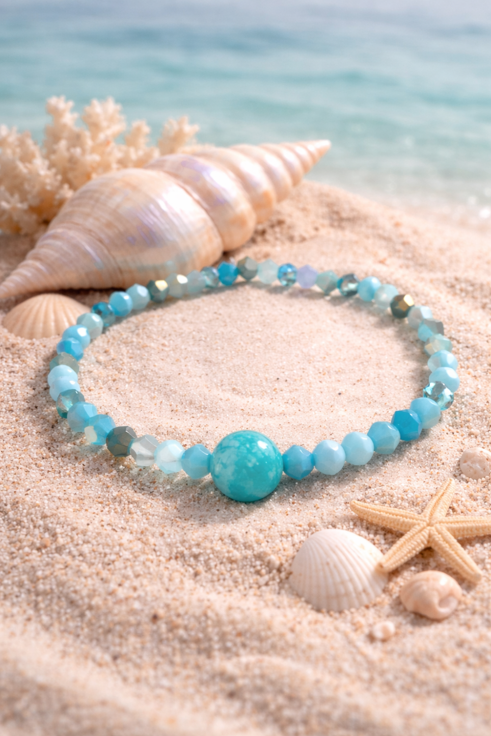 Ce bracelet élastique de 16 cm est composé de délicates perles bleues lumineuses, sublimées par une pierre centrale en amazonite, reconnue pour sa douce énergie d’équilibre et de sérénité.