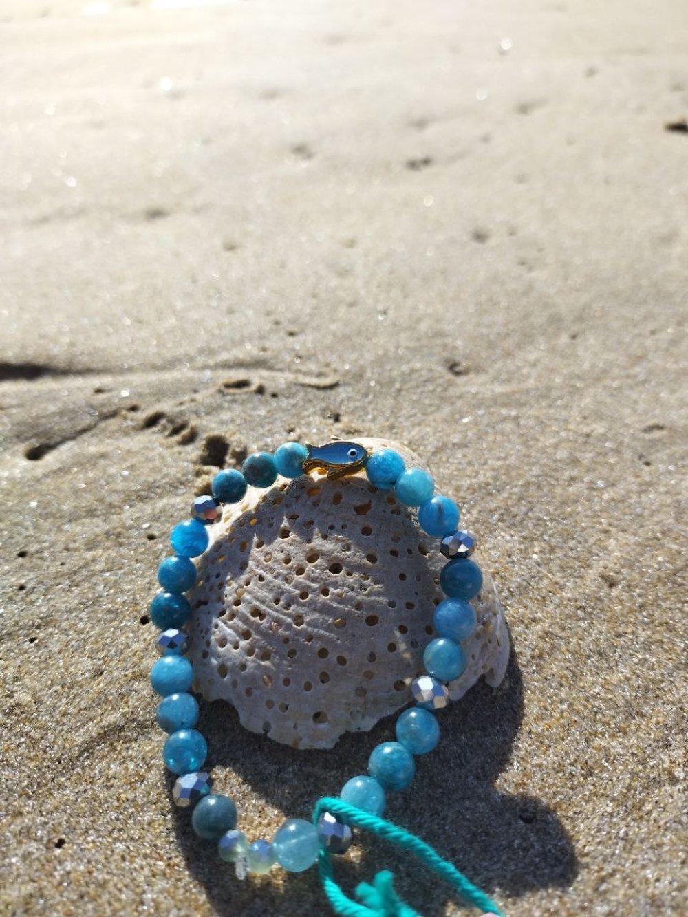 Bracelet élastique de 16 cm composé d’élégantes perles d’apatite bleue, accompagné d’un petit poisson symbole de fluidité et de liberté 🐟✨