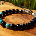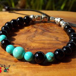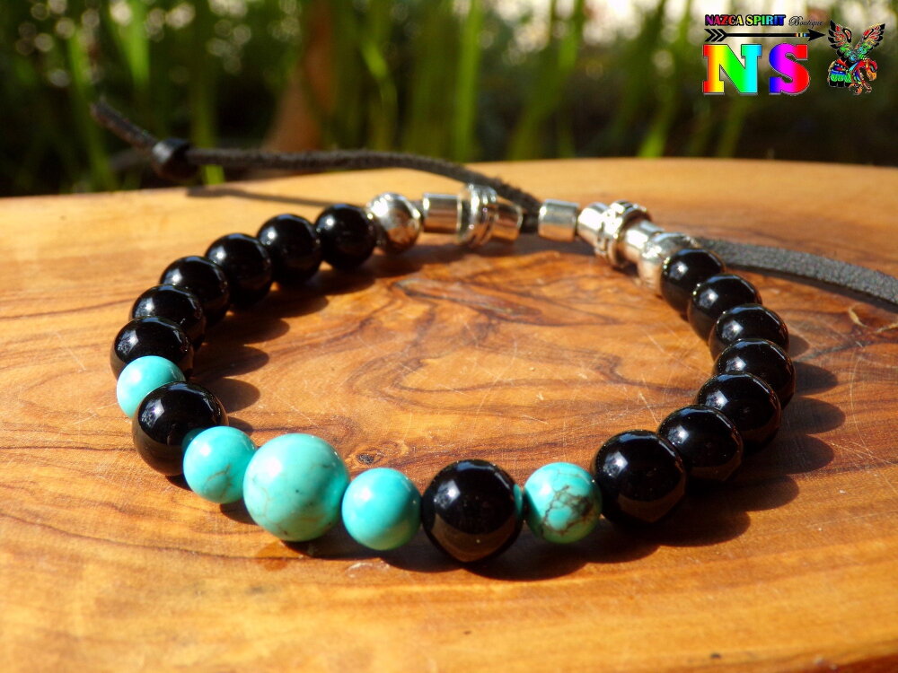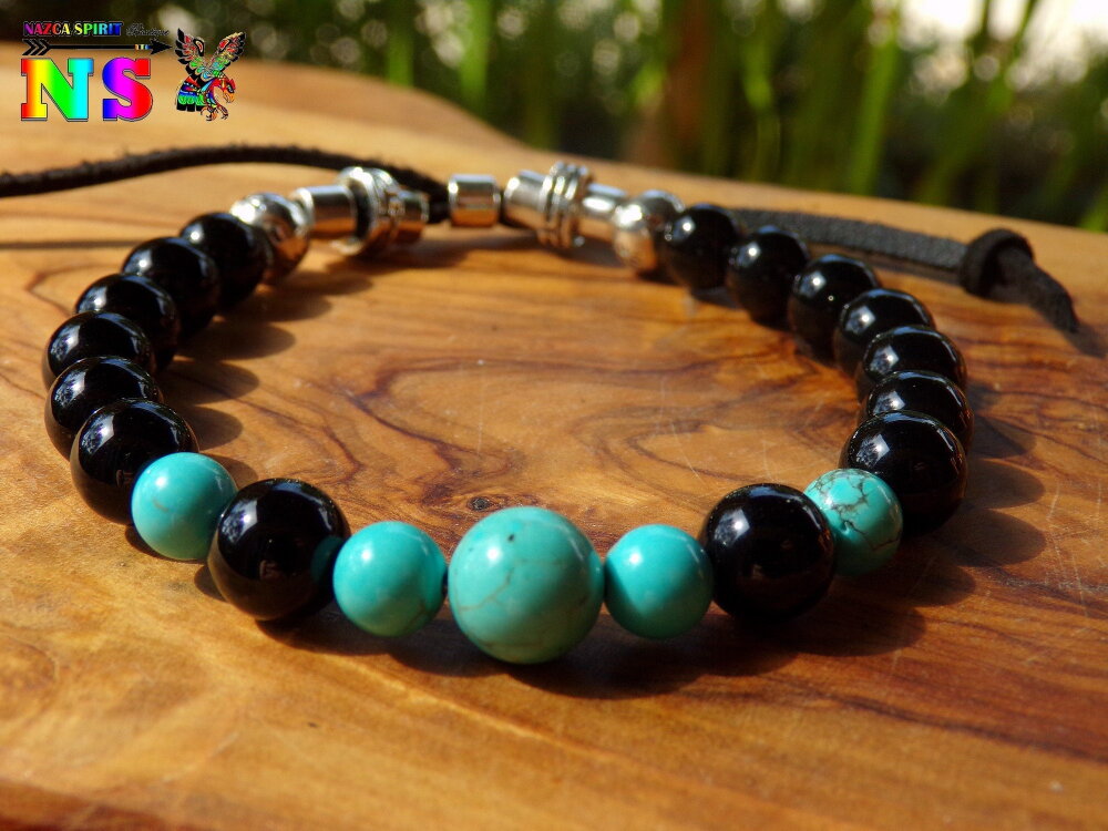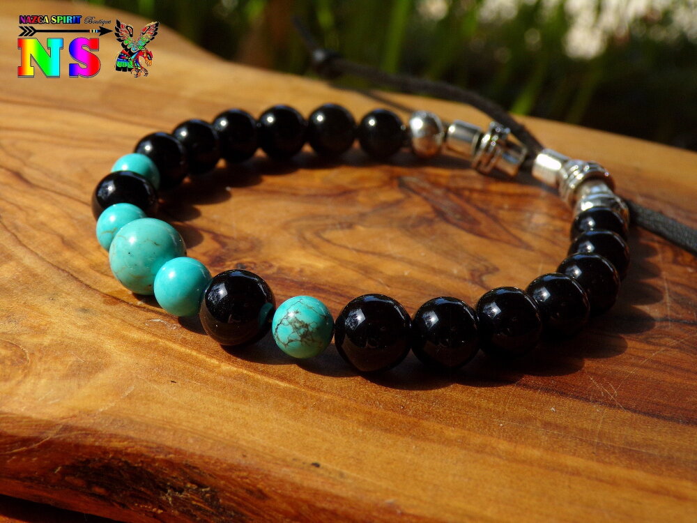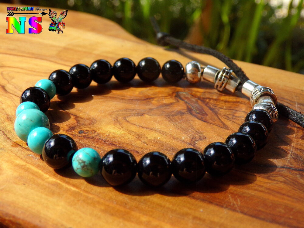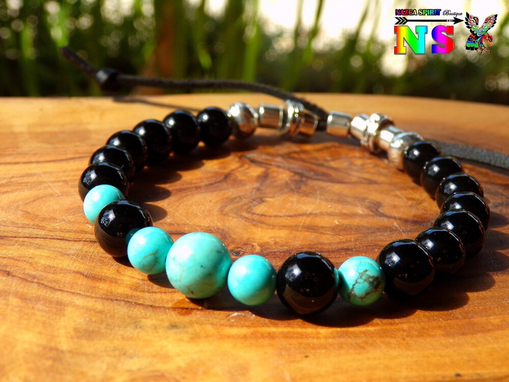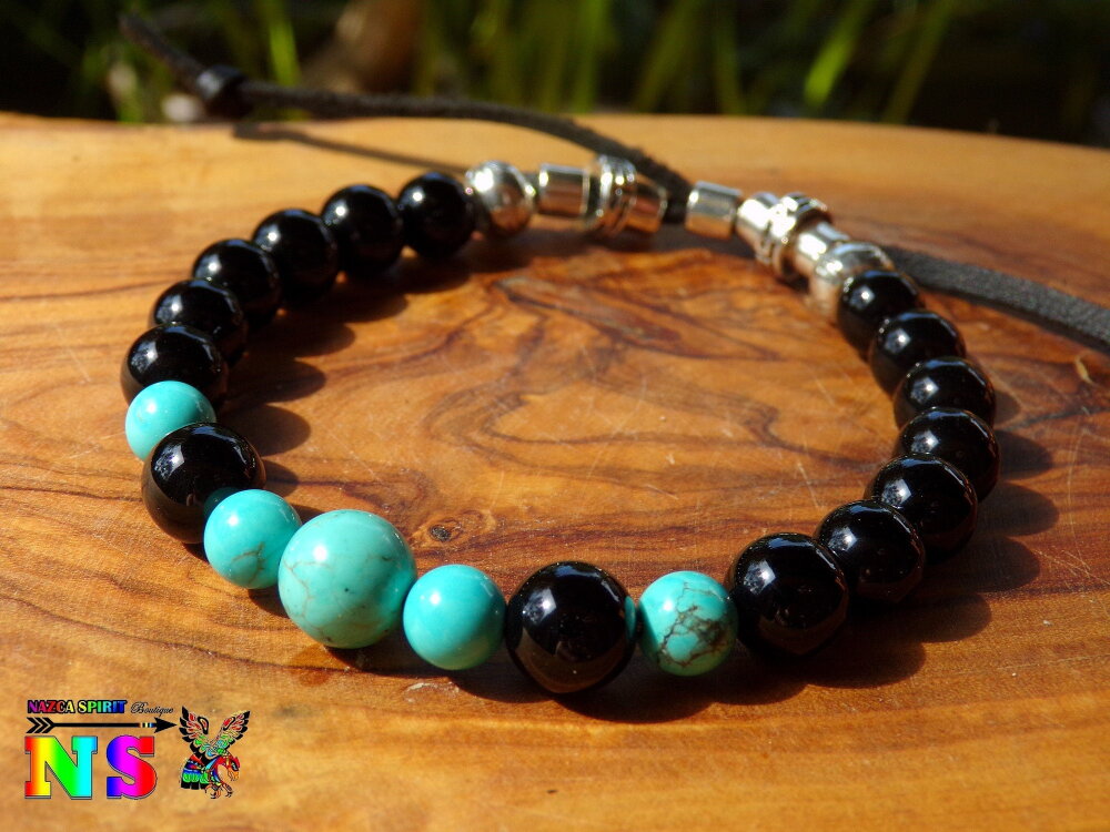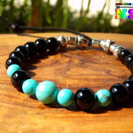 Bracelet tibétain ajustable bohème ethnique - Création artisanale - Bracelet en perles d'onyx noire et turquoises naturelles USA