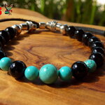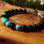 Pour réaliser ce bracelet, j'ai utilisé 15 perles rondes en onyx noire de 8 mm ("0.31), 4 perles rondes de 6 mm ("0.23) en turquoises naturelles (origine : USA) et 1 perle ronde de 8 mm ("0.31) en turquoises naturelles (origine : USA).