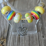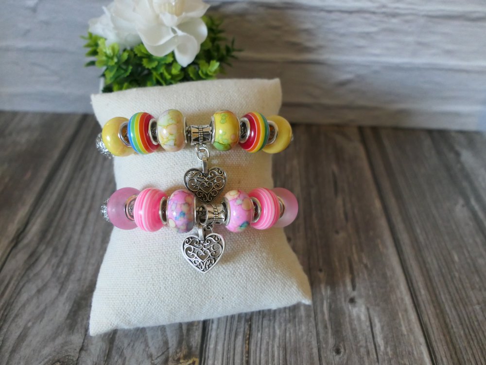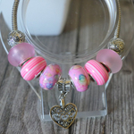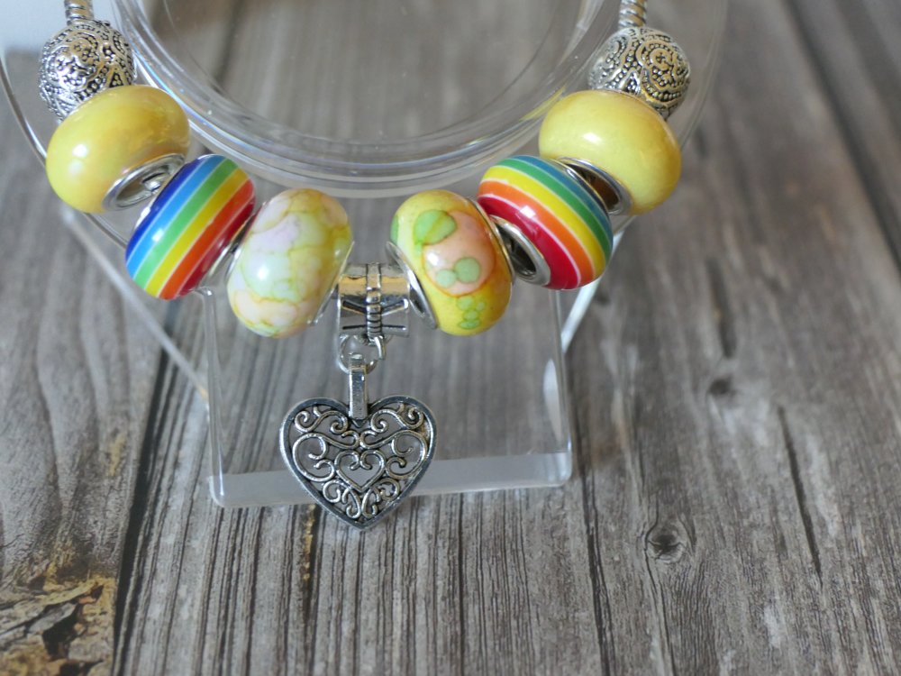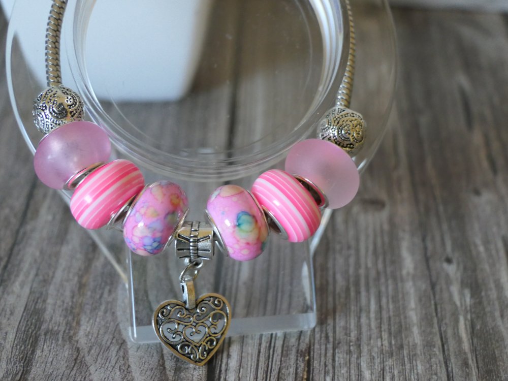 Ce bracelet élégant est composé d’une chaîne serpent ajustable (16 cm + 5 cm de rallonge) et orné de magnifiques perles européennes en verre et résine, accompagnées de perles d'espacement en alliage de zinc (sans nickel). Le bracelet est sublimé par un pendentif cœur argenté ajouré qui lui donne une touche romantique.