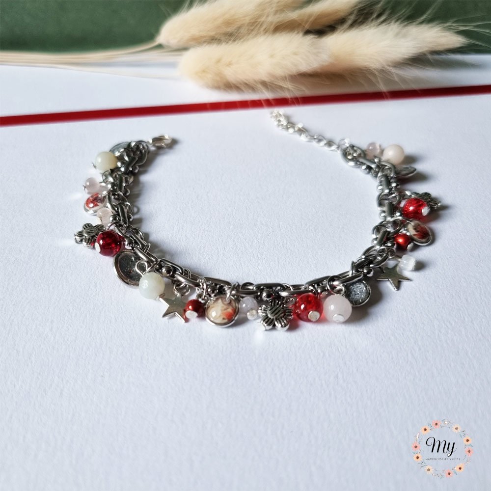 bracelet à breloques en argile polymère et résine entièrement conçues à la main, étoile de noël, fleur de poinsettia.