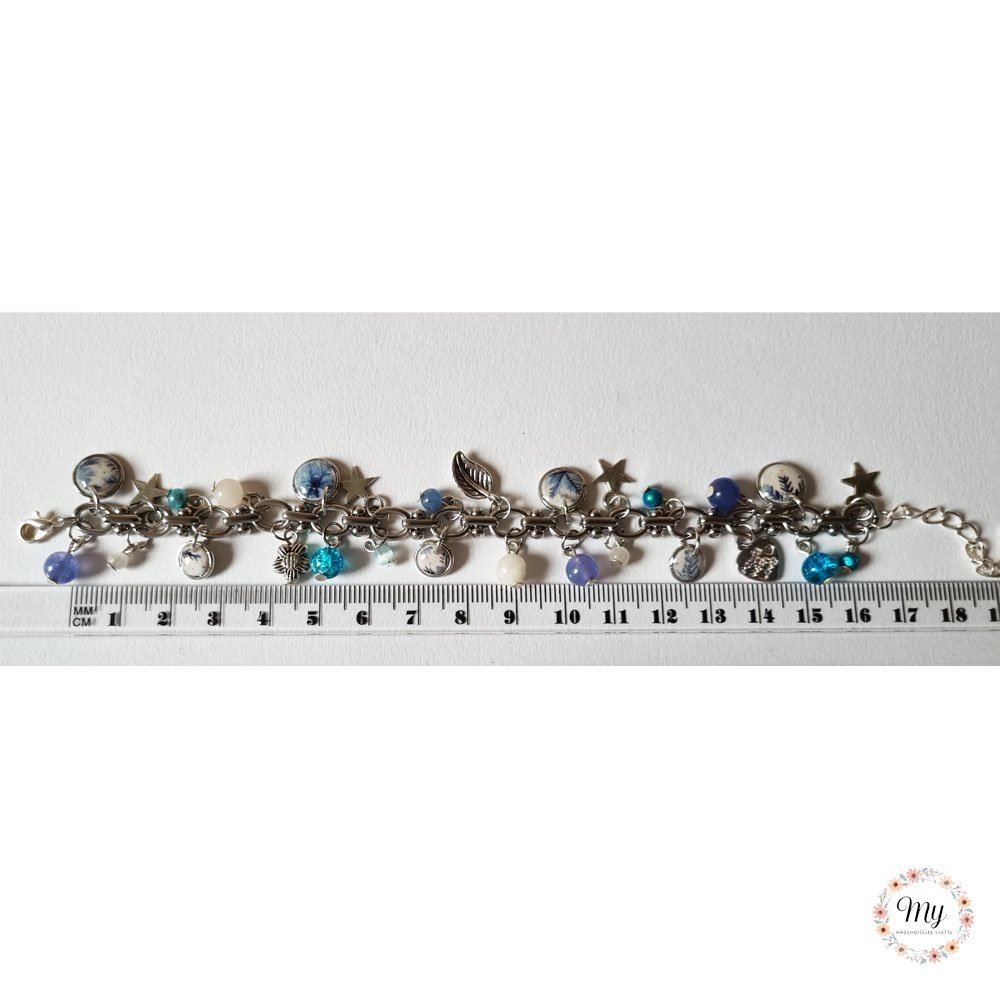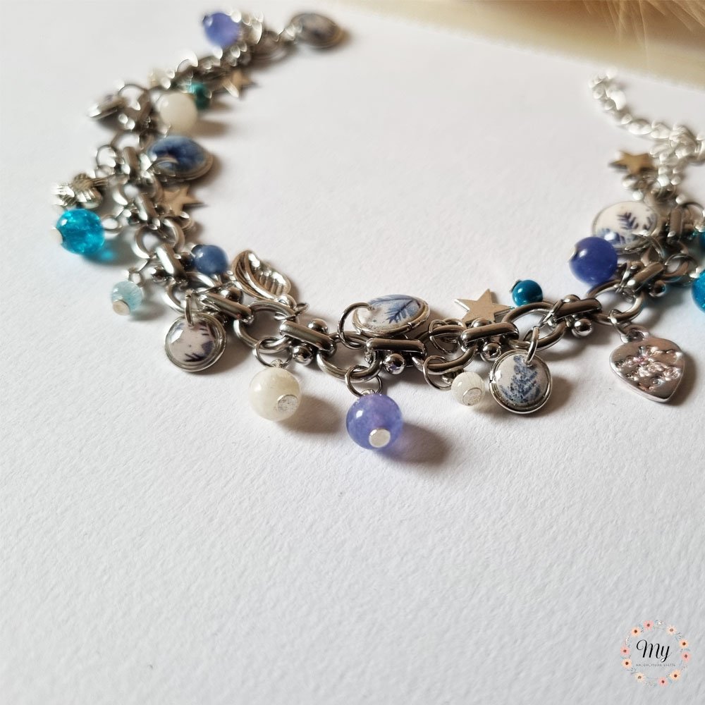 bracelet à breloques en argile polymère et résine entièrement conçues à la main, flocons bleu et blanc.