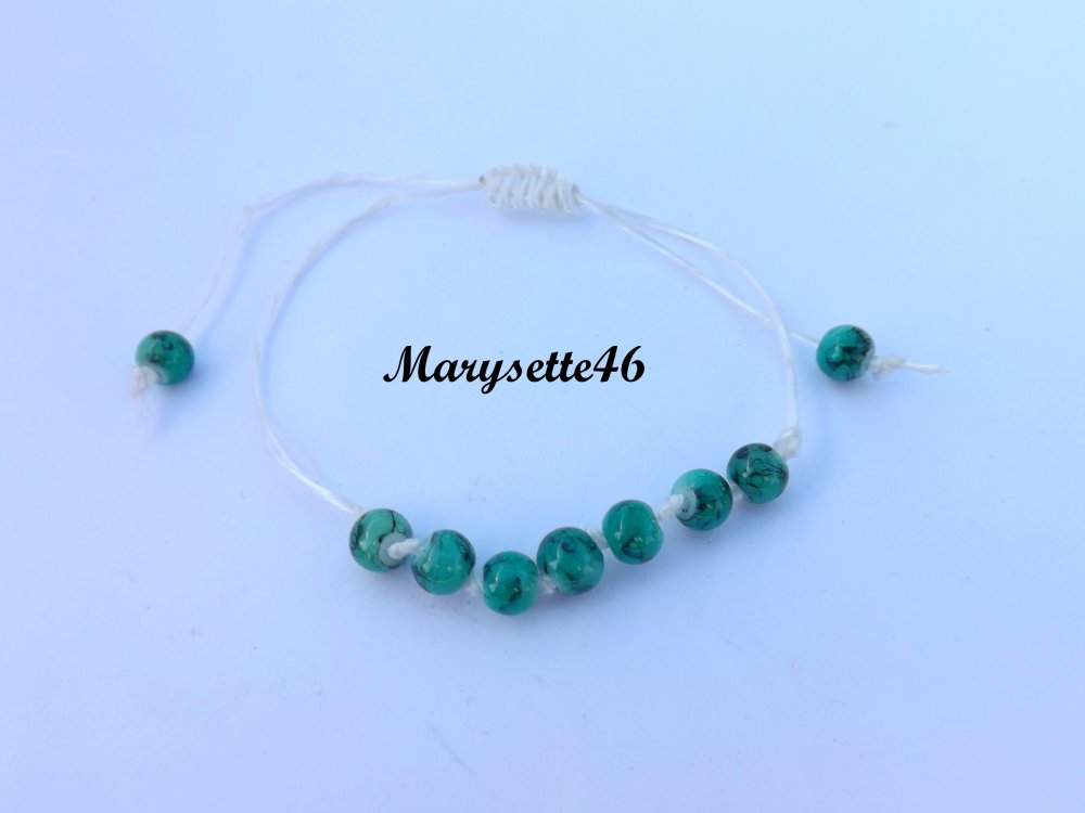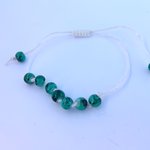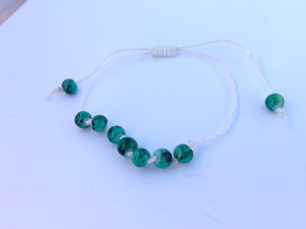 Bracelet en fin cordon fil polyester couleur blanche où sont insérées 7 perles de verre vert foncé marbrées de noir de 6 mm espacées par un nœud. Chaque perle est différente.