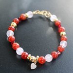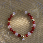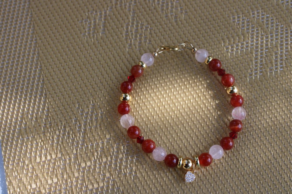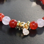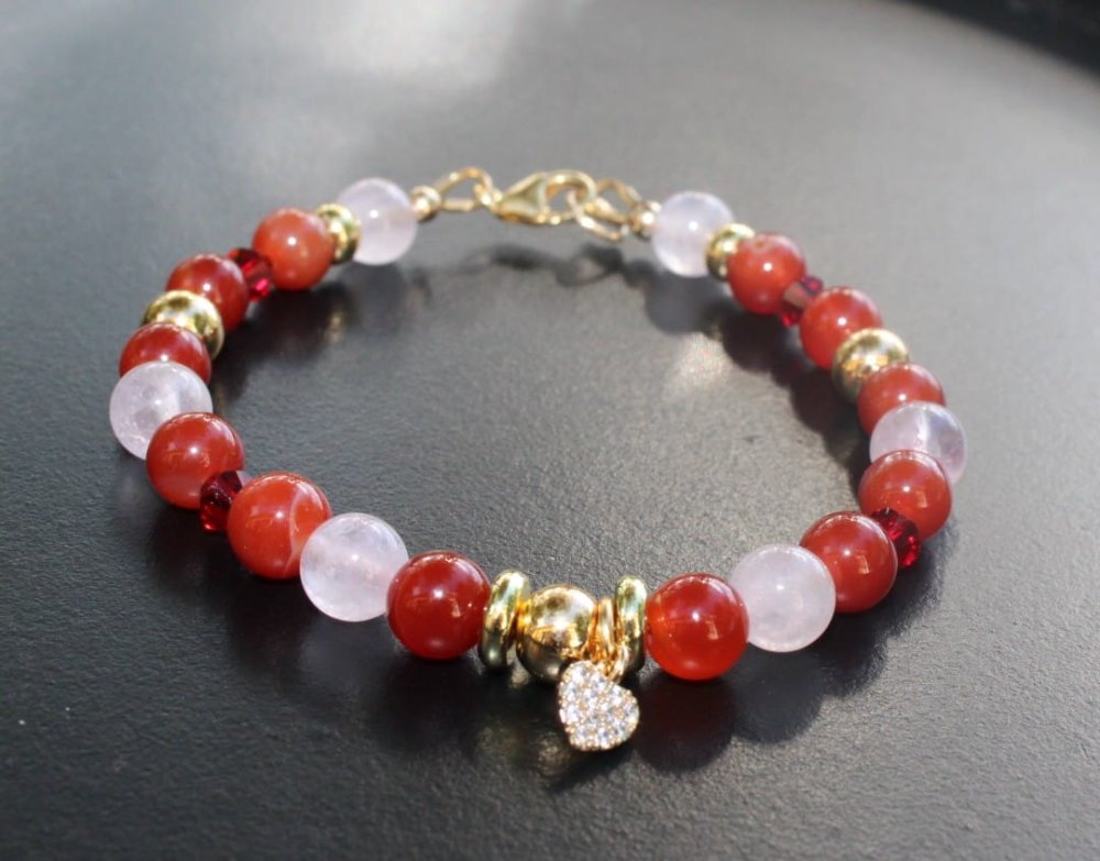 Perles d’Agate Rouge de 6 mm – énergie et ancrage, de Perles de Quartz Rose – amour, apaisement et douceur, de Toupies en cristal rouge pour une touche lumineuse et des Intercalaires et breloque cœur plaqué or 14K.