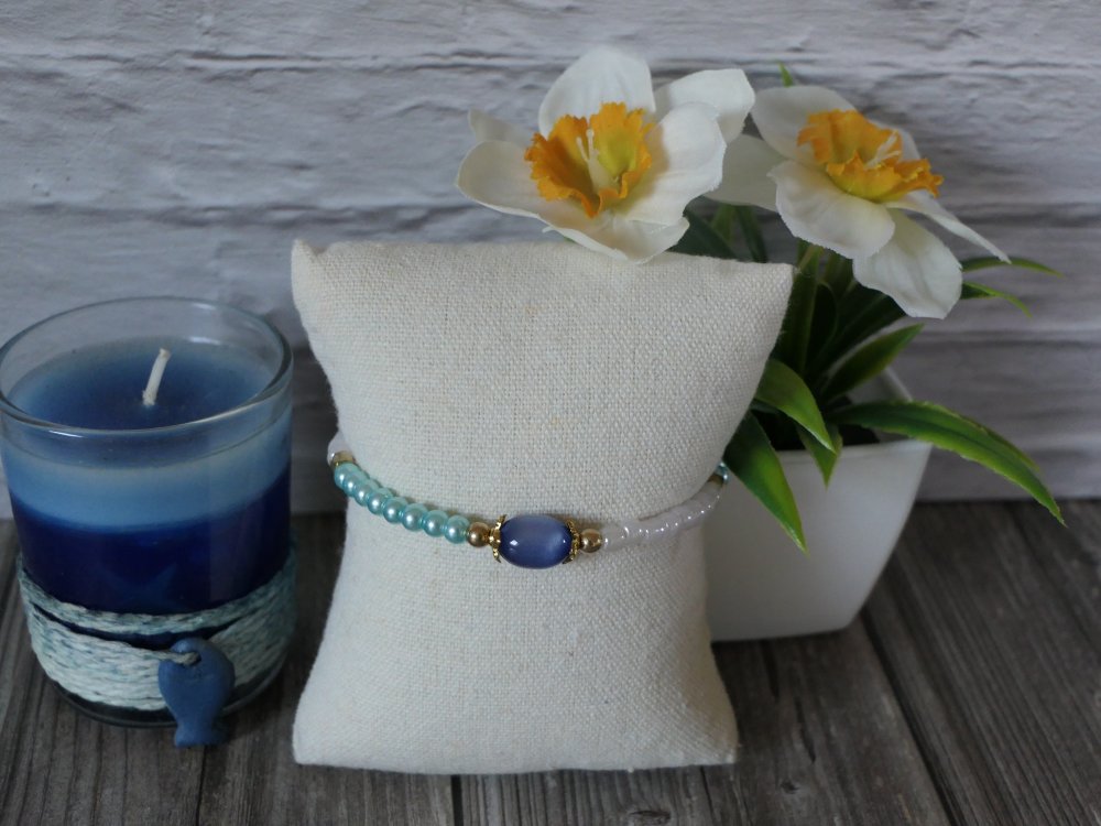 Bracelet en perles de verre et œil de chat bleu – tons turquoise et blanc