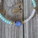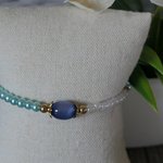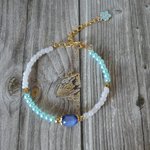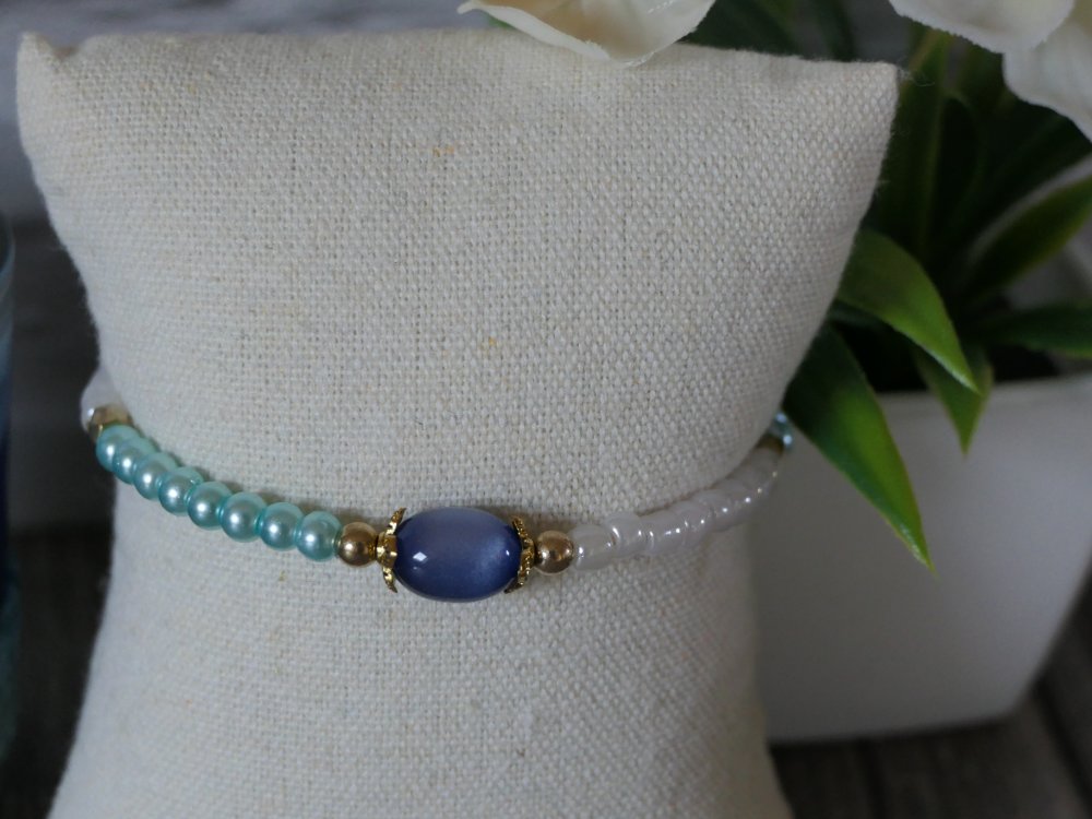 - Matières : Perles de verre 4 mm, perle œil de chat ovale, apprêts dorés