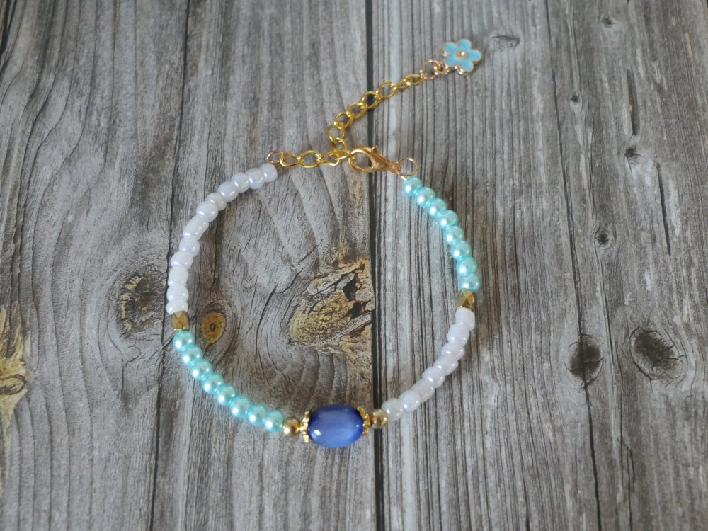 Bracelet ajustable en perles de verre et œil de chat bleu – tons turquoise et blanc
