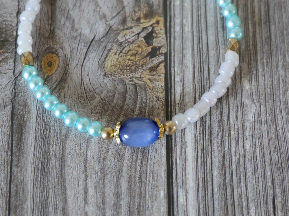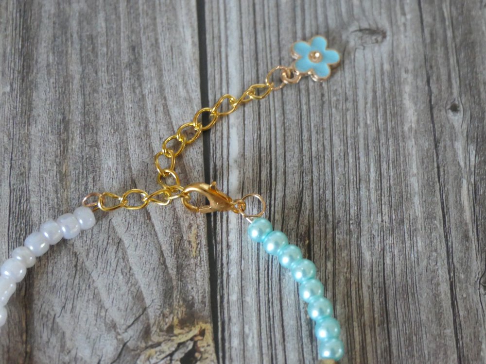 Il est composé de perles de verre de 4 mm dans de superbes nuances de blanc nacré et turquoise, rehaussées de petites perles dorées pour une touche lumineuse et raffinée.