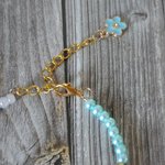 Le bracelet s’adapte facilement à un poignet de 15 à 19 cm, grâce à sa chaînette de rallonge dorée de 5 cm, terminée par un petit pendentif fleur bleue pour une finition élégante et féminine.