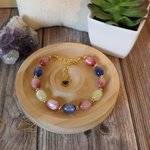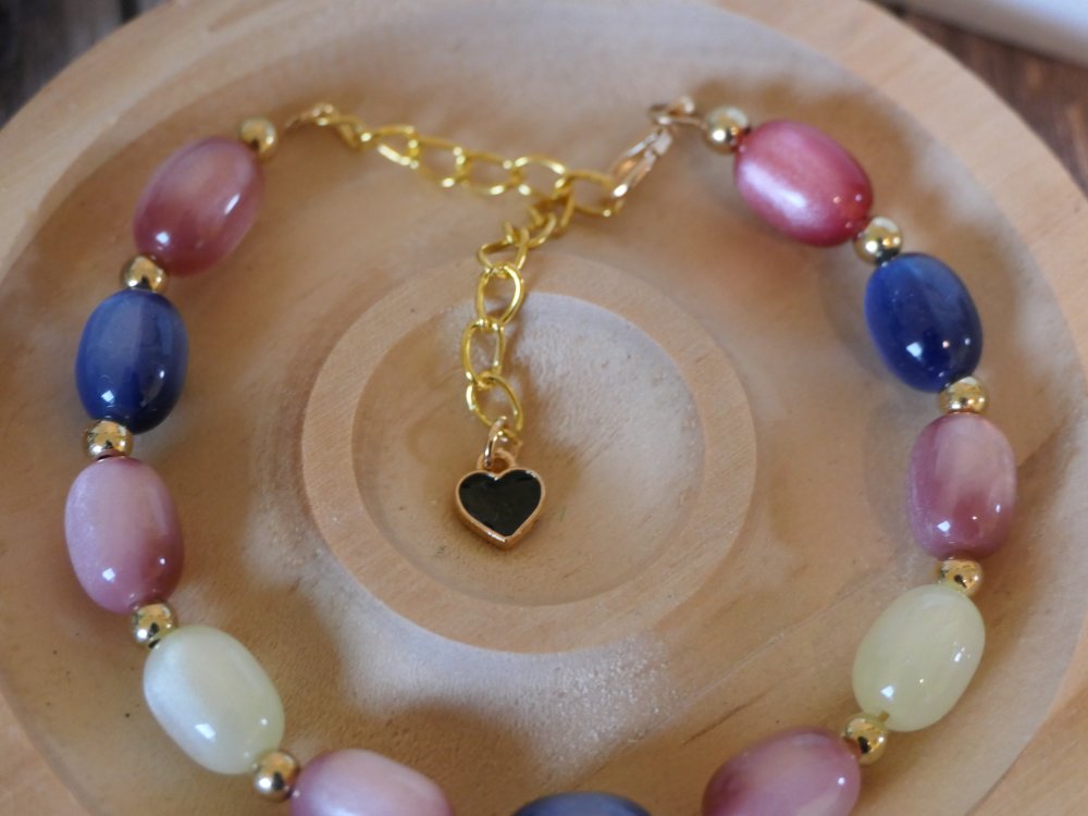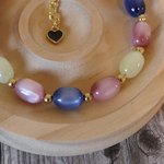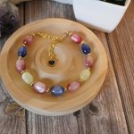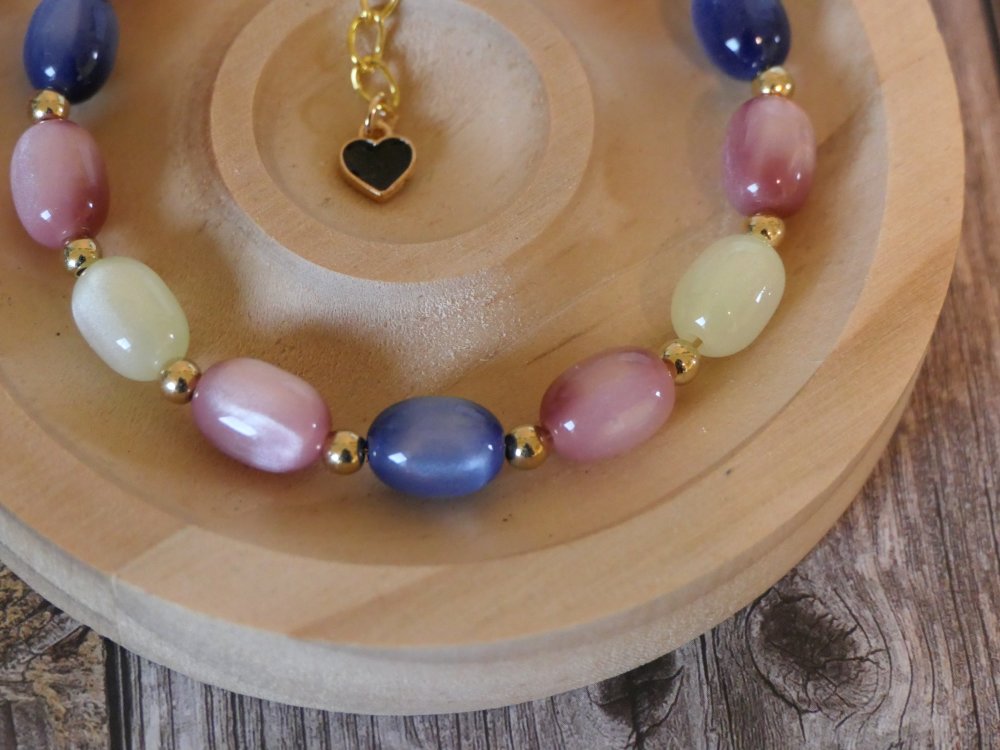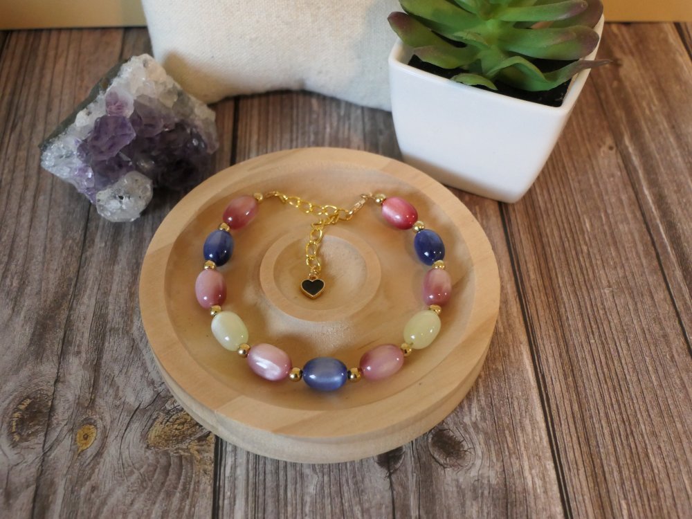 Il est composé de perles œil de chat ovale de 8 mm de diamètre, dans de superbes nuances : bleu, écru et mauve, rehaussées de petites perles dorées pour une touche lumineuse et raffinée.