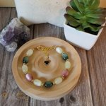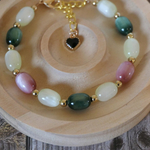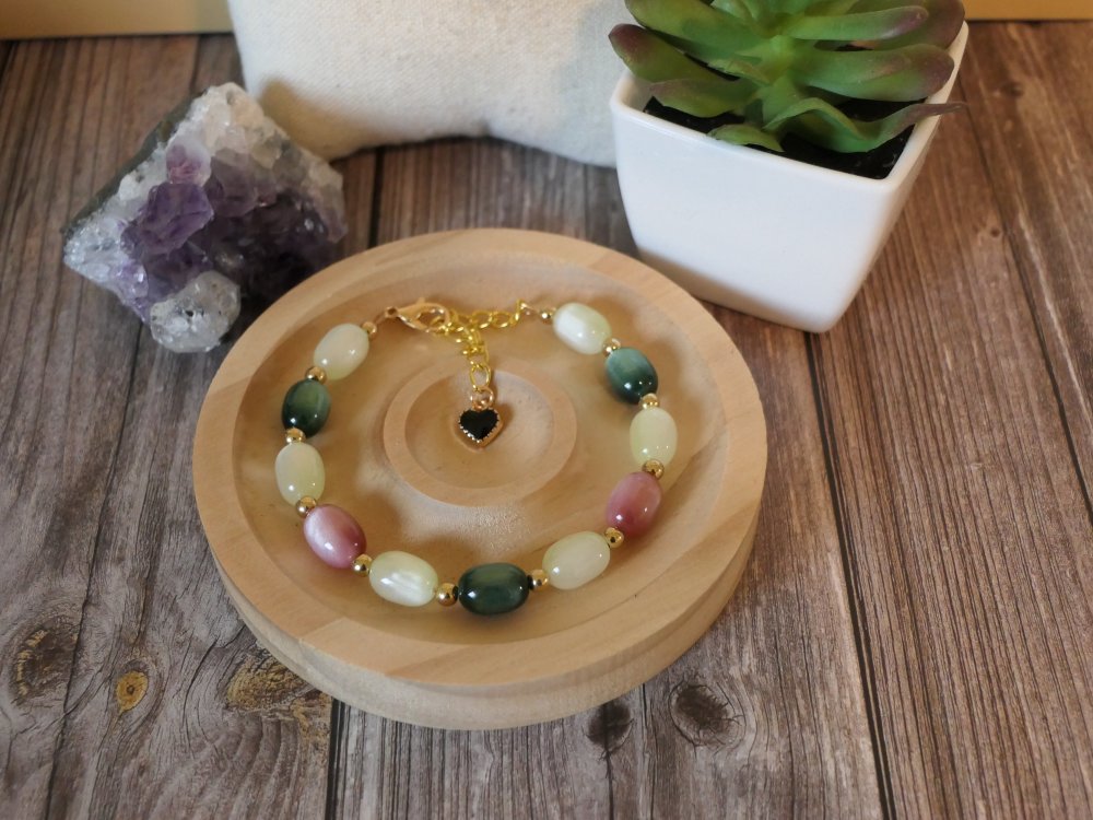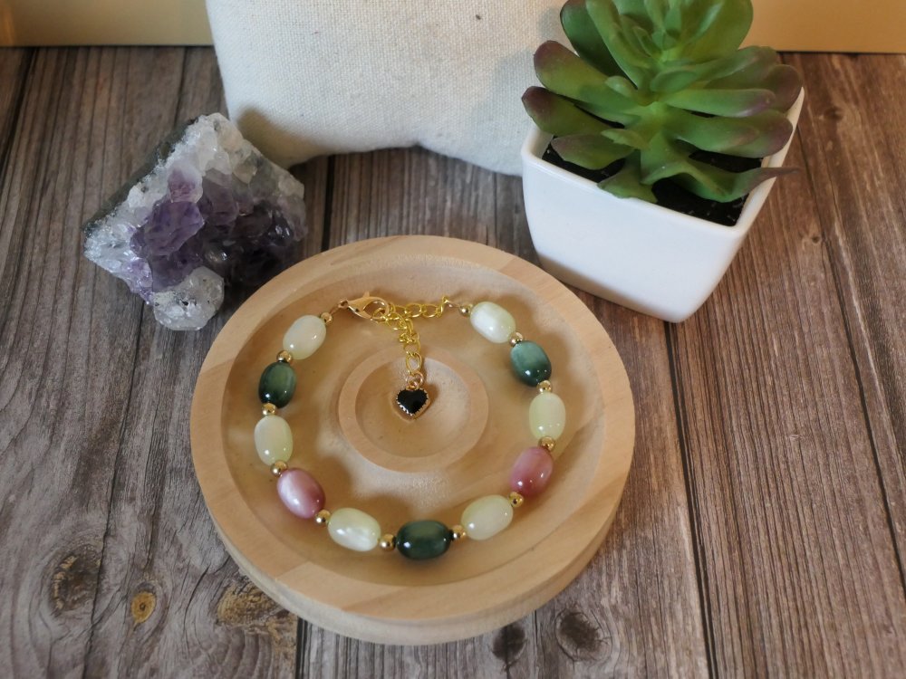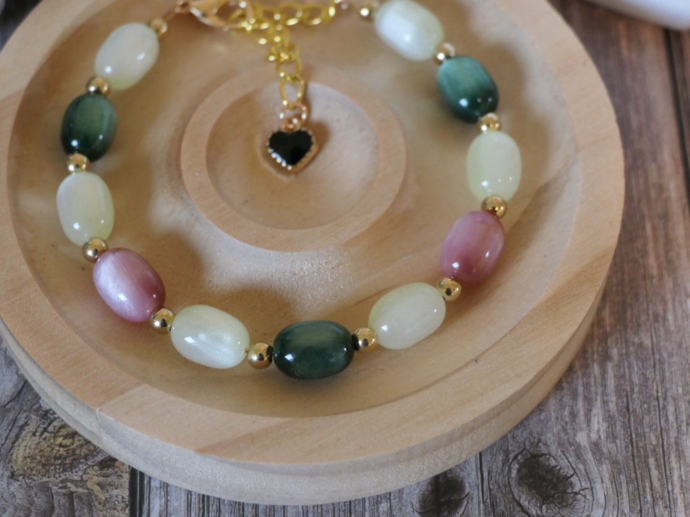Il est composé de perles œil de chat ovale de 8 mm de diamètre, dans de superbes nuances : vert, écru et mauve, rehaussées de petites perles dorées pour une touche lumineuse et raffinée.