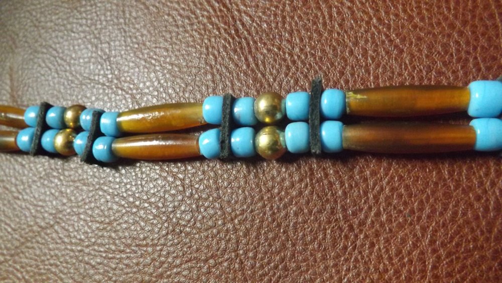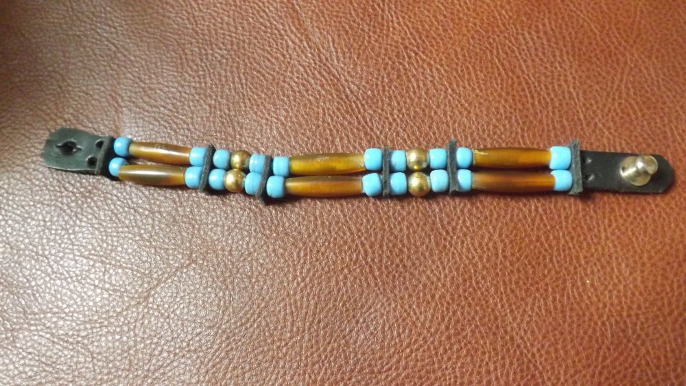 Bracelet Amérindien - 2 rangs, corne et perles de verre bleu et metal couleur bronze