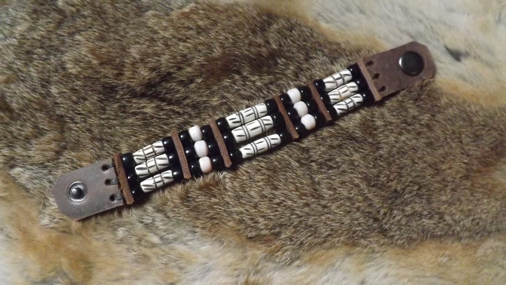 Bracelet amérindien 3 rangs, os sculptés et perles de verre noires et beiges