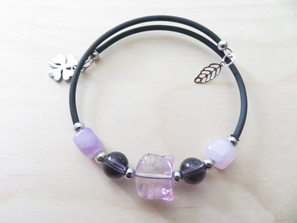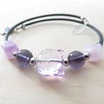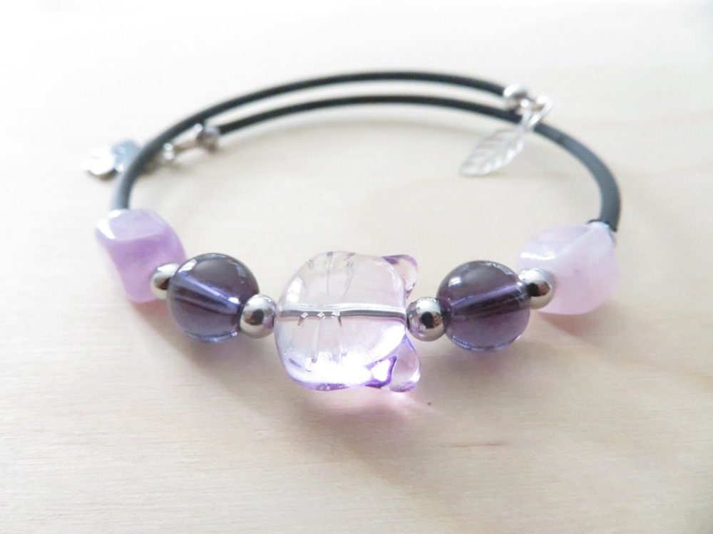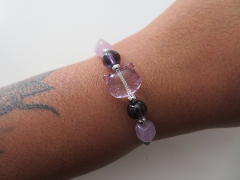 Bracelet en pierres naturelles Améthyste et chat en verre avec fil mémoire