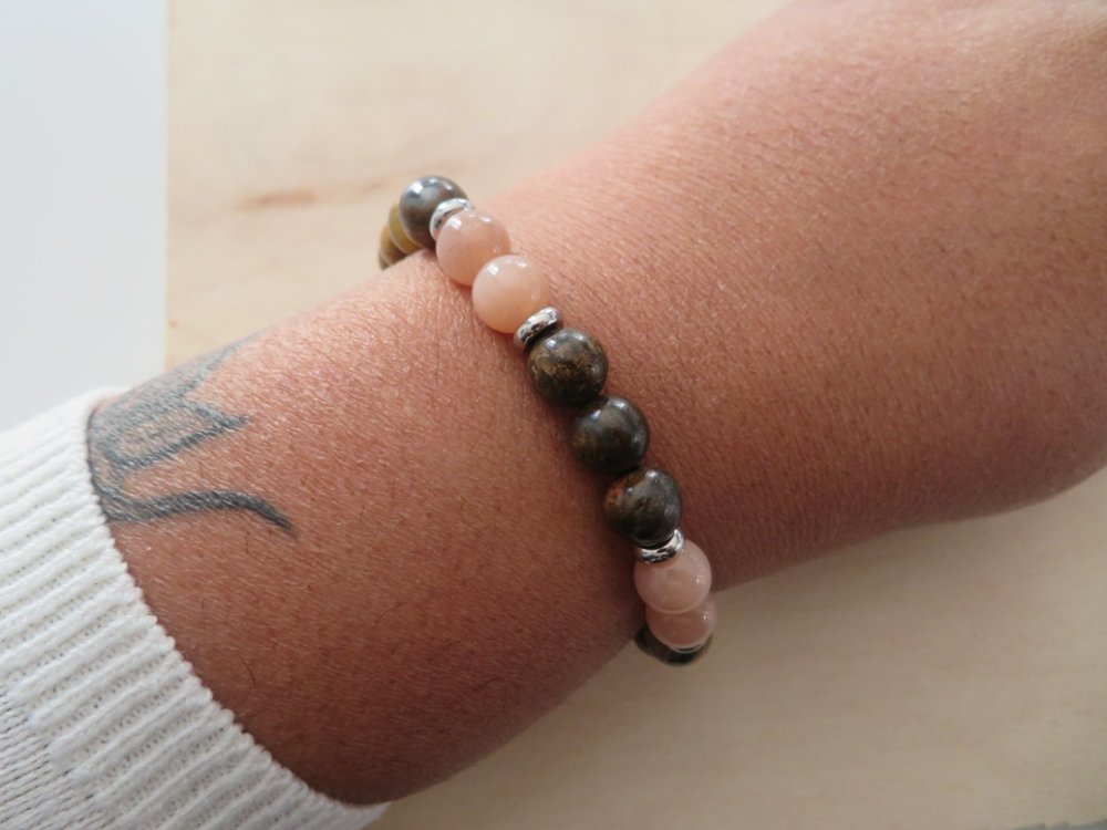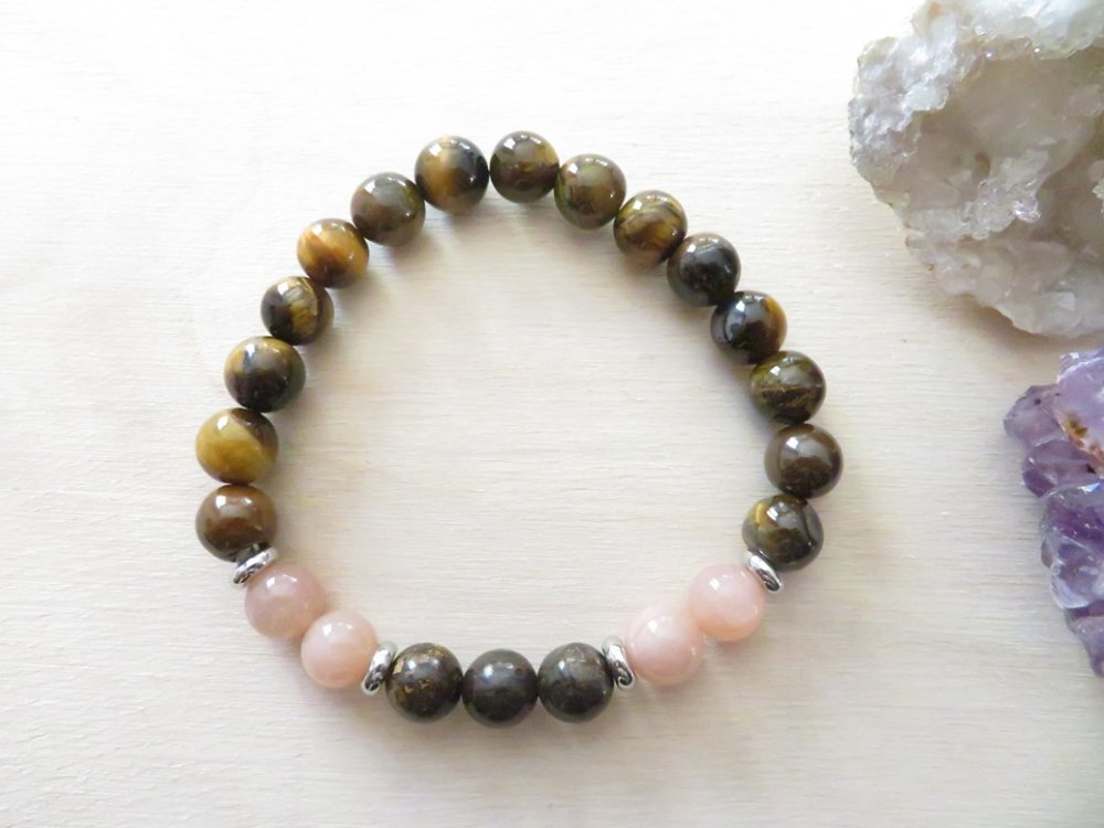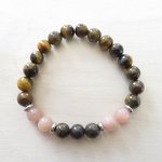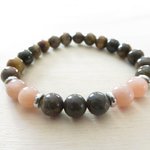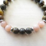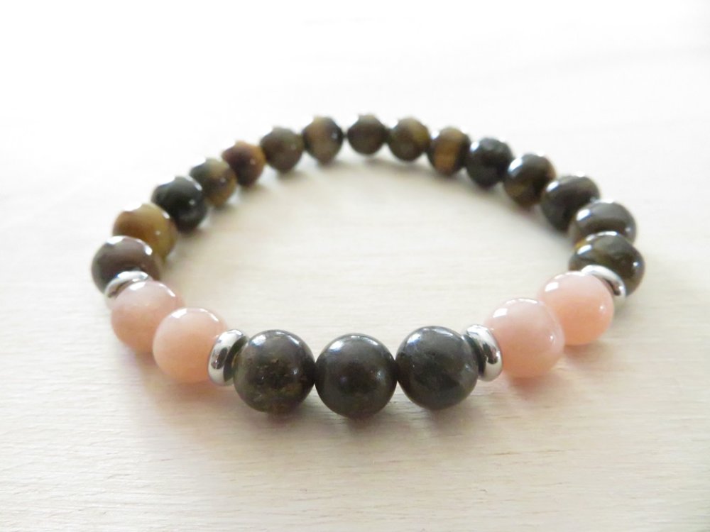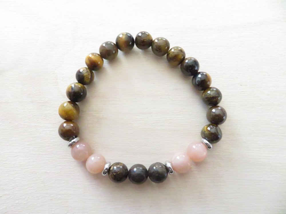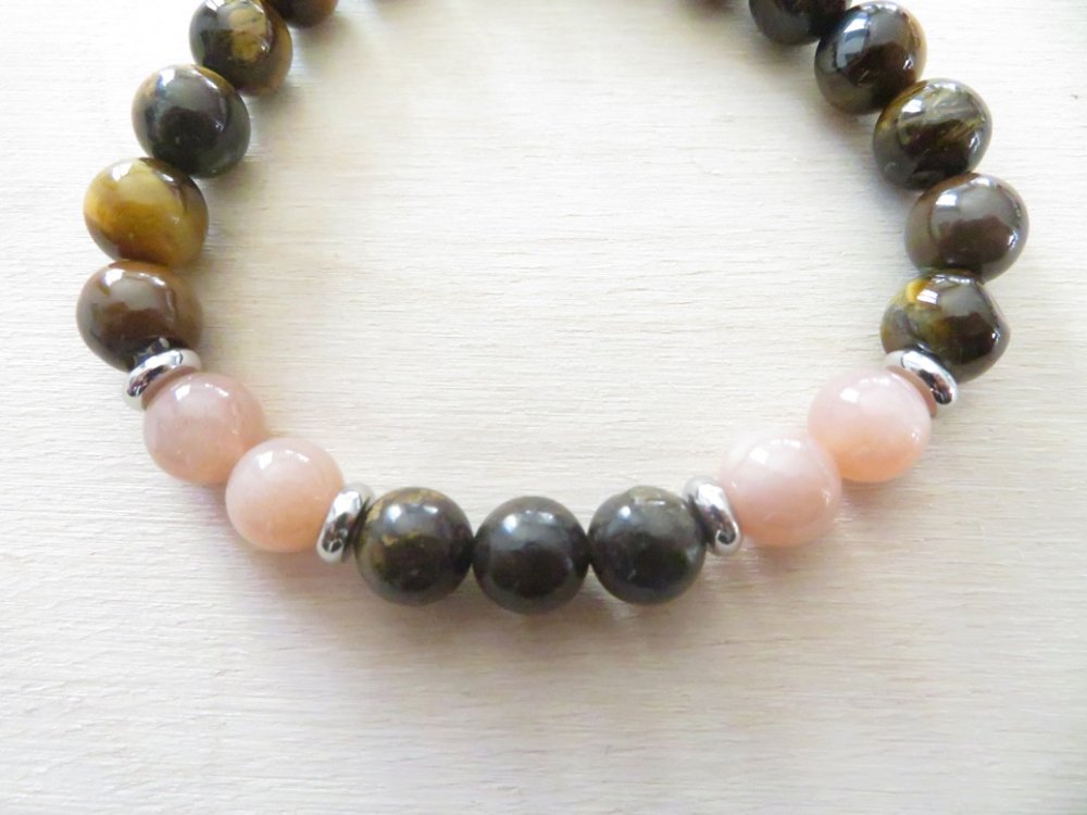 Perles naturelles Œil de tigre (rondes 8 mm), Perles naturelles Pierre de soleil (rondes 8 mm), Perles naturelles Bois fossilisé (rondes 8 mm), Entretoises en acier inoxydable