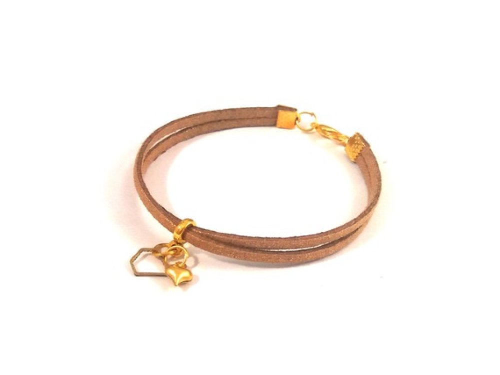 Les embouts pince, le passe ruban, et le fermoir mousqueton sont en métal doré. Le ruban est en suédine beige doré.