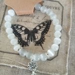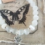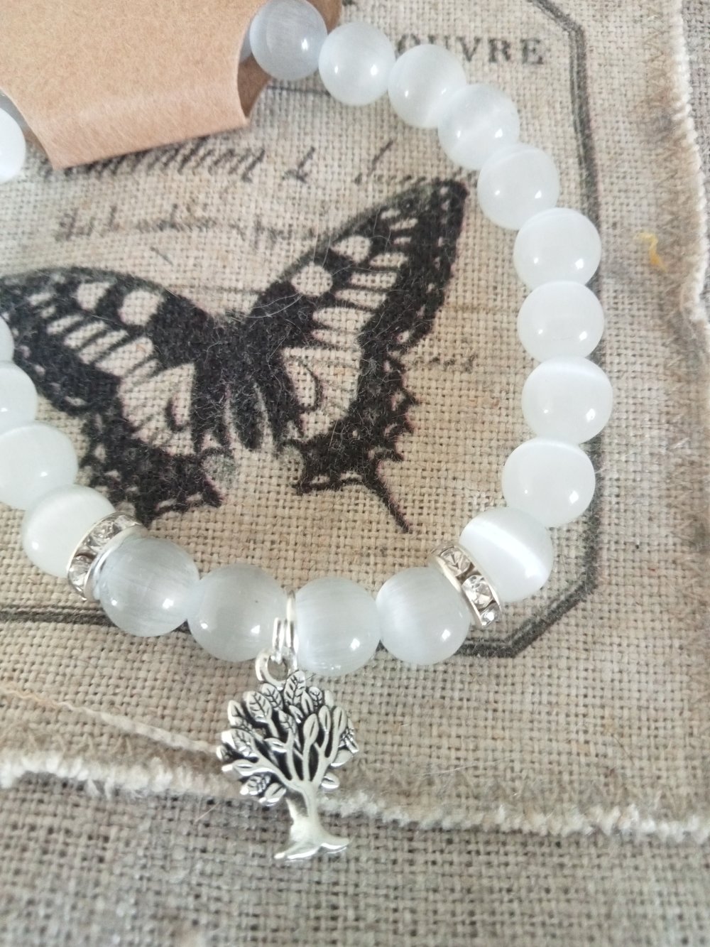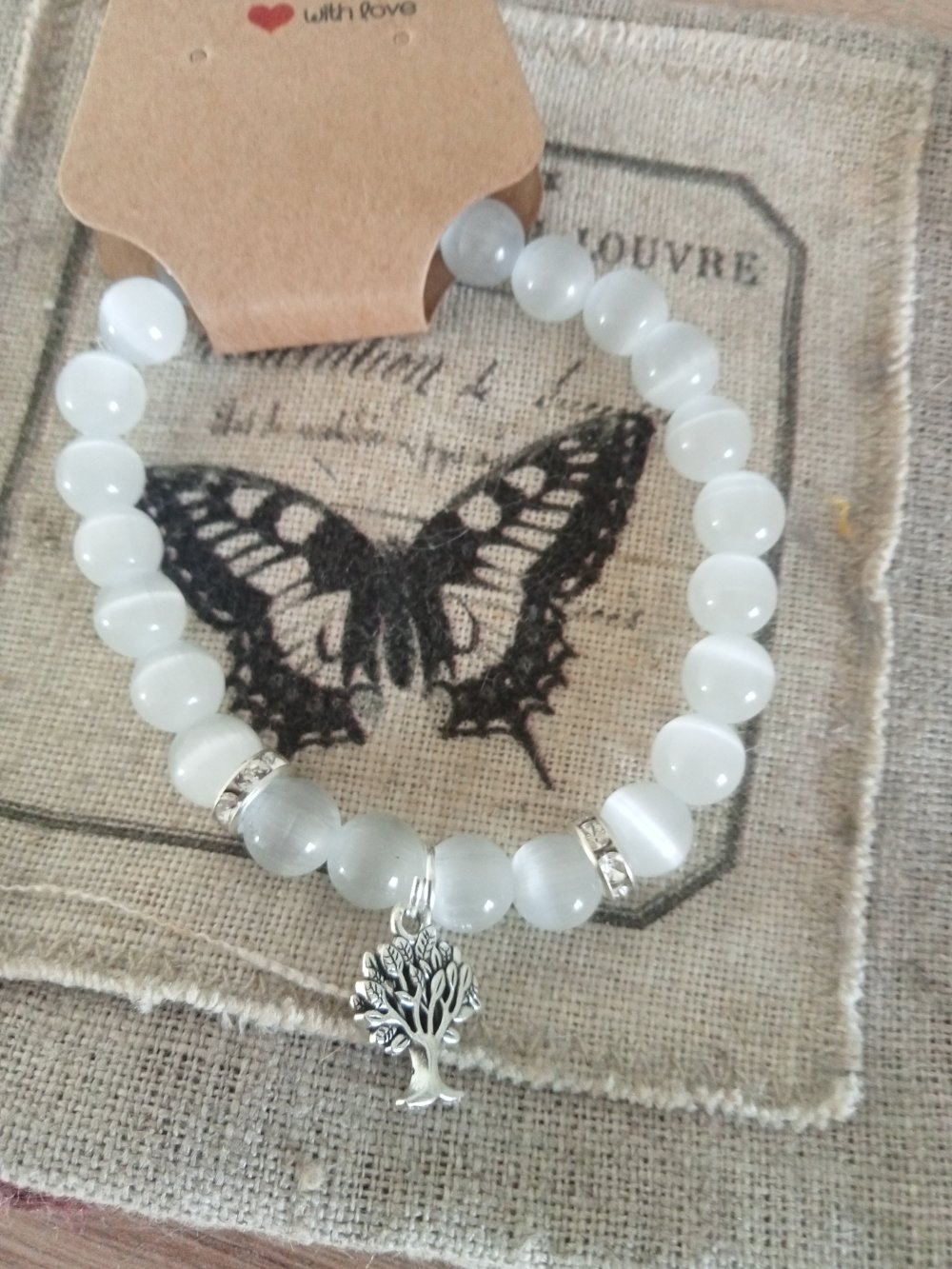 Bracelet perle 8 mm monter sur un élastique de 19 cm en perle d'œil de chat et pampilles argenté arbre de vie