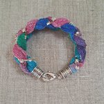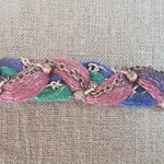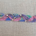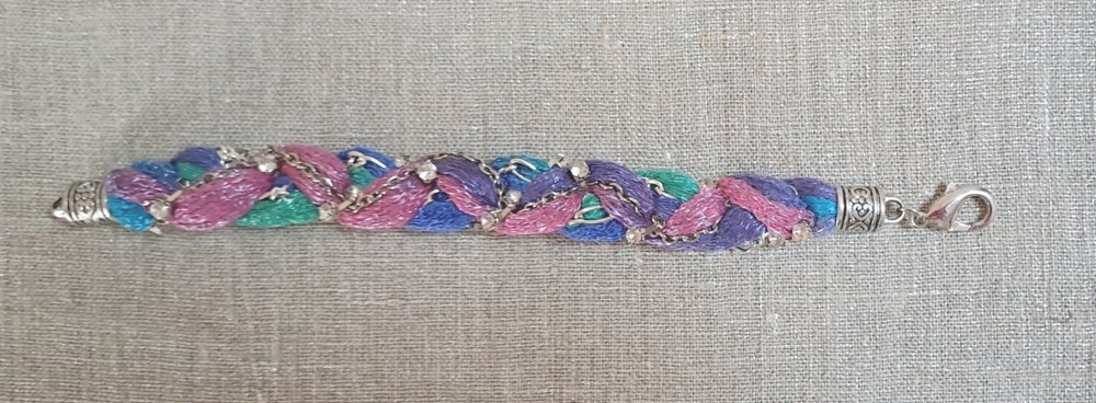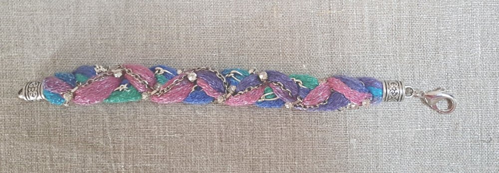Bracelet bleu , rose , vert ,réalisé en tressant ensemble de la laine , une chaine très fine et un ruban de petits strass .