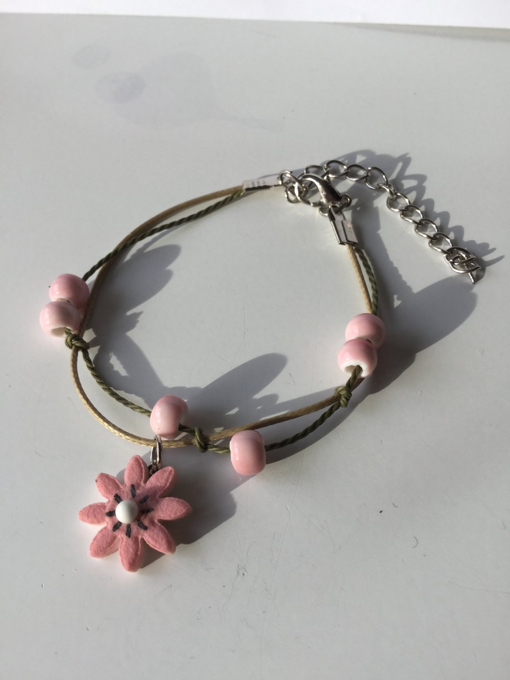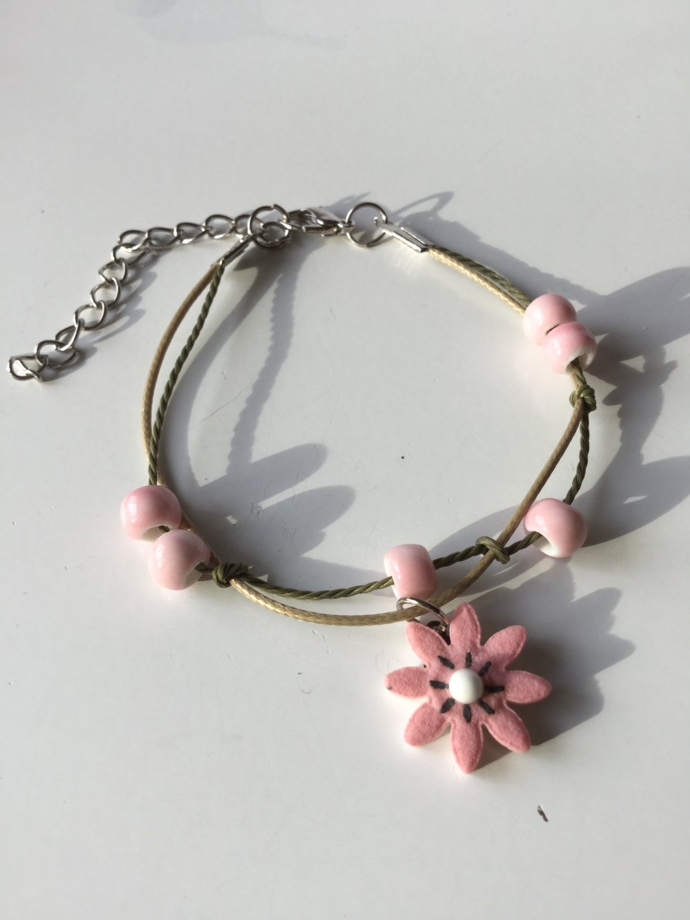 Bracelet fin, esprit bohème, composé de 6 perles et une fleur de céramique rose glissées sur deux fils de lin naturel ciré.