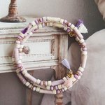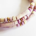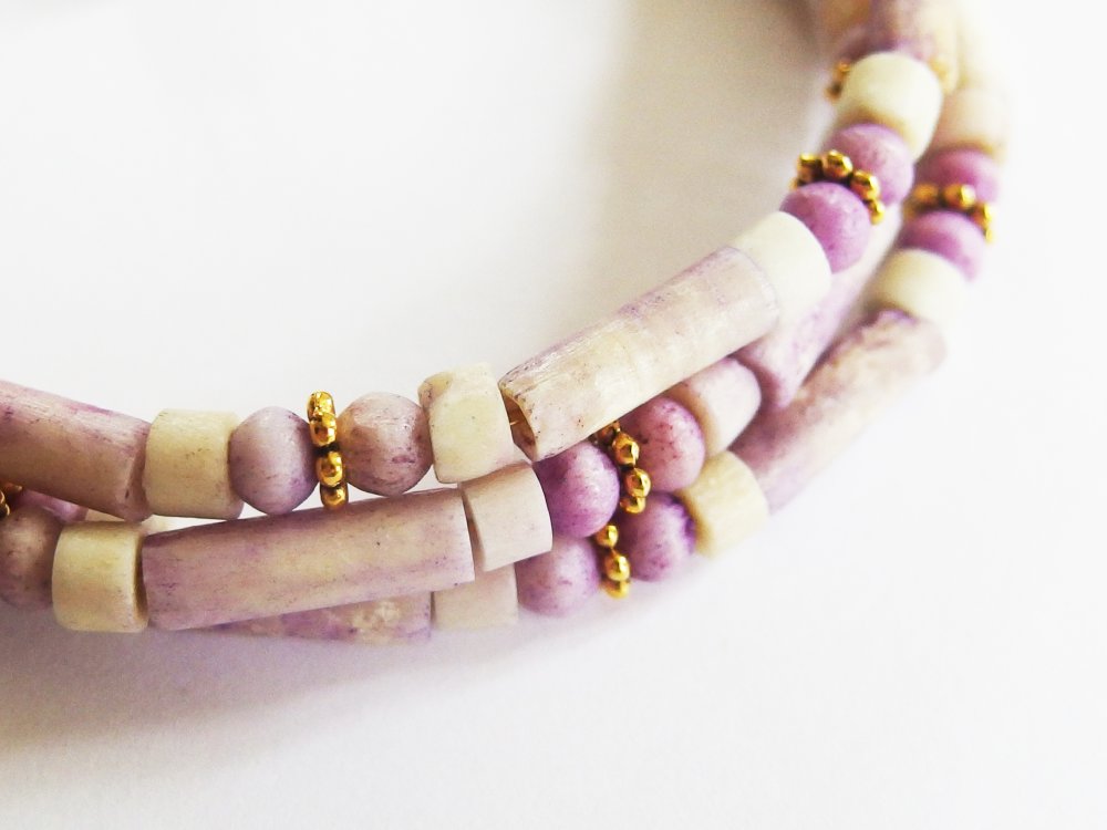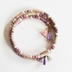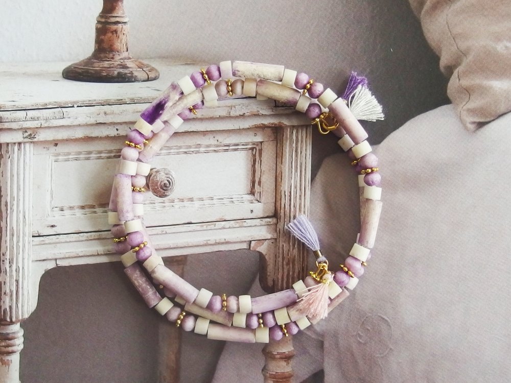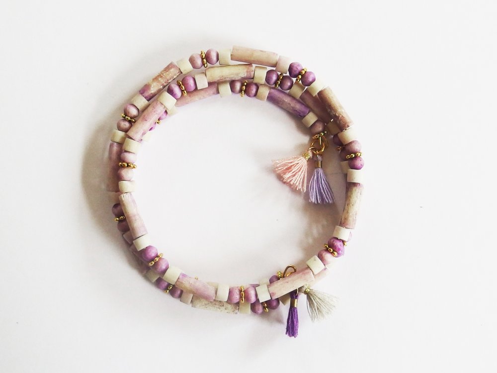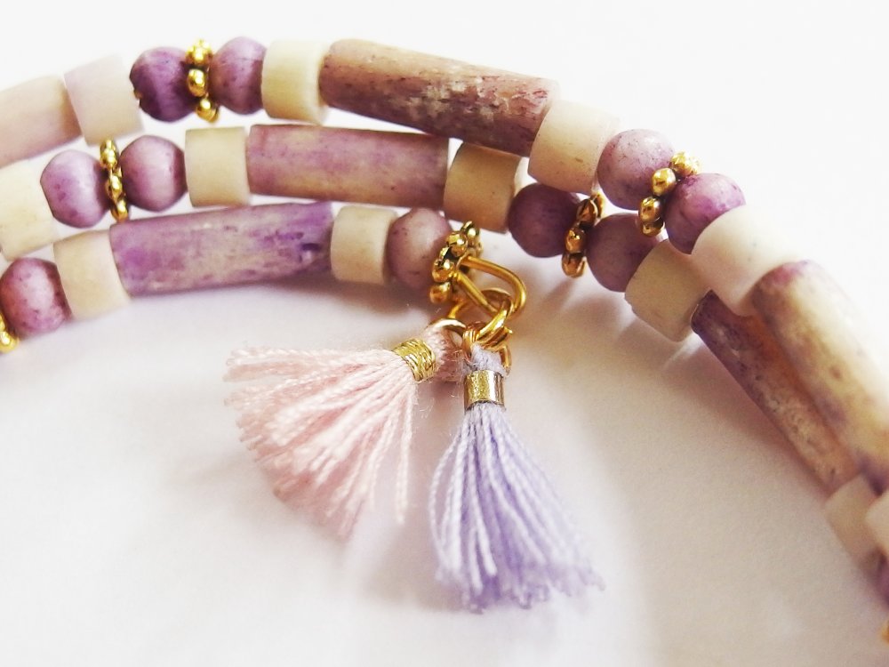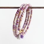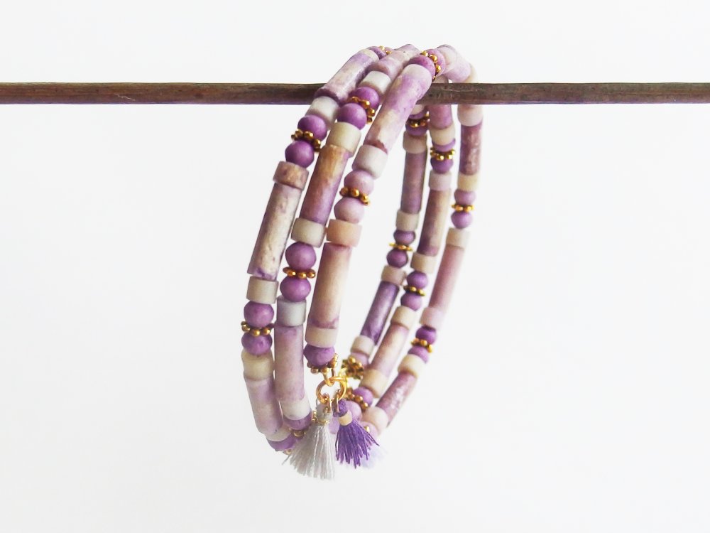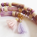 Bracelet constitué de perles tube en épine d'oursin véritable et petites en bois violet. Monté sur 3 rangs, avec fil métal doré à mémoire de forme. Des pompons aux couleurs assorties finissent ce bijou en beauté.