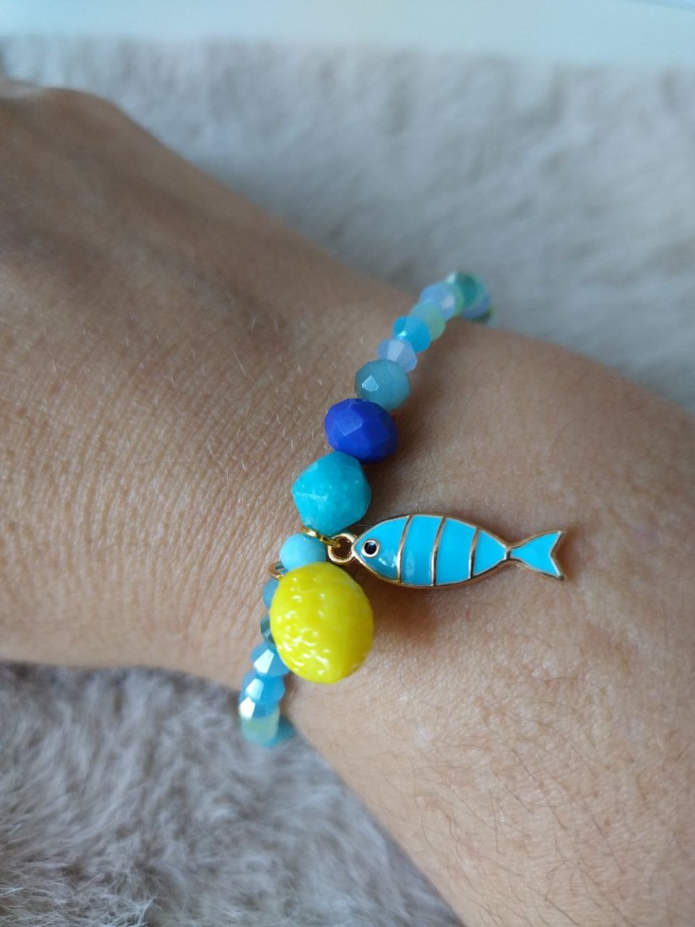 Orné d’une pierre d’amazonite, d’un poisson 🐟 et d’une pampille citron 🍋, ce bijou est une véritable invitation à la légèreté, à la joie et à l’expression de soi ✨