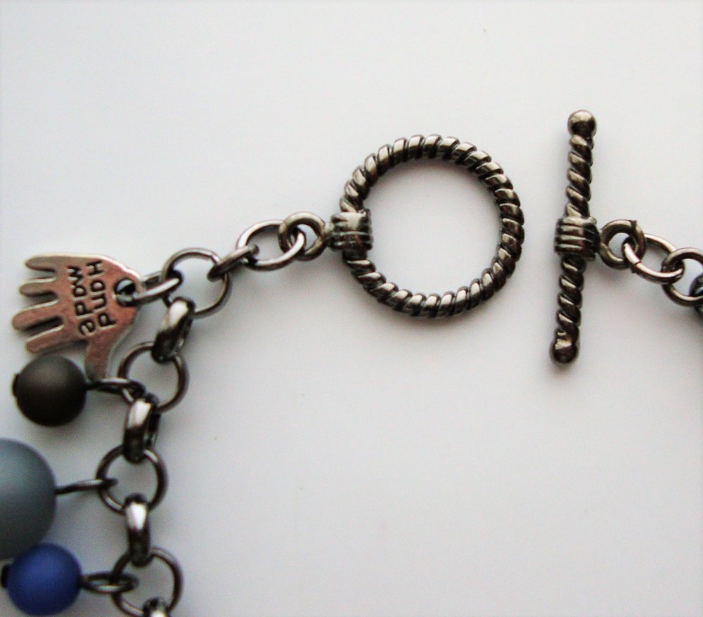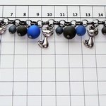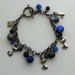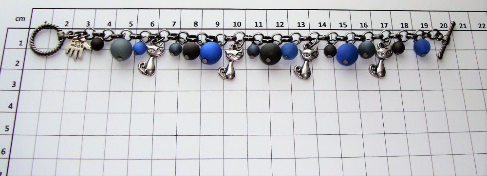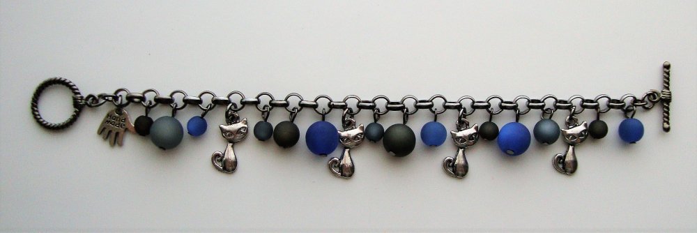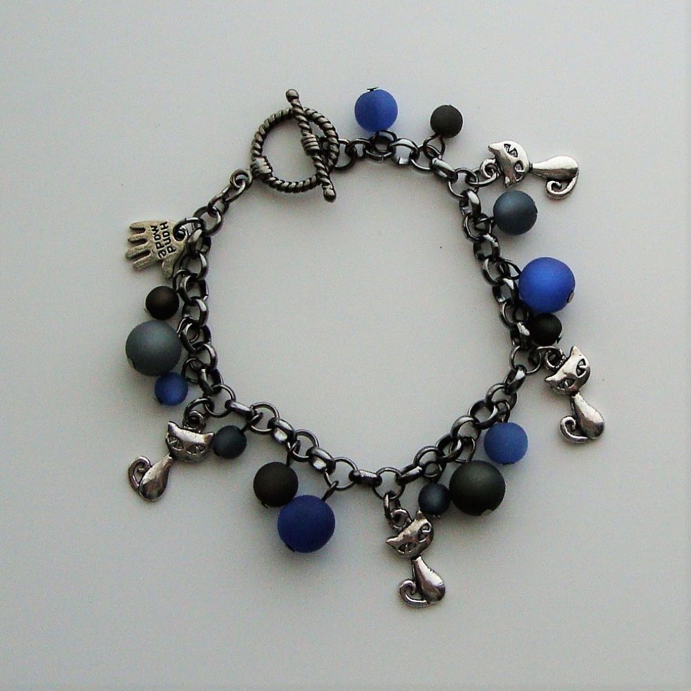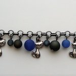 Bracelet en métal argenté : breloques en formes de chat perles en polyester noir, bleu foncé et gris, fermoir T.