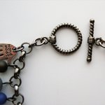 Bracelet composé d’une chaîne maille rollo aux maillons de 6 mm terminée par un fermoir T en métal noir de 16 mm sur laquelle sont accrochées diverses perles et breloques en métal argenté :