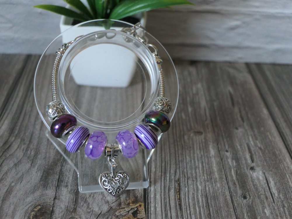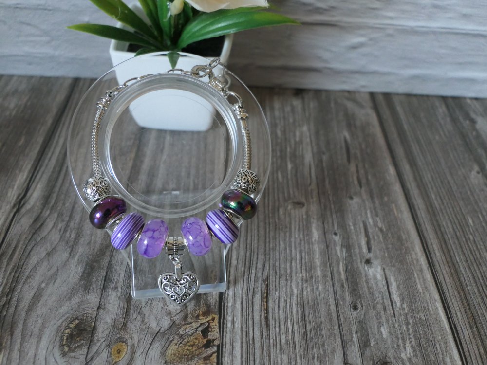 Ce bracelet élégant est composé d’une chaîne serpent ajustable (16 cm + 5 cm de rallonge) et orné de magnifiques perles européennes en verre et résine, accompagnées de perles d'espacement en alliage de zinc (sans nickel). Le bracelet est sublimé par un pendentif cœur argenté ajouré qui lui donne une touche romantique.