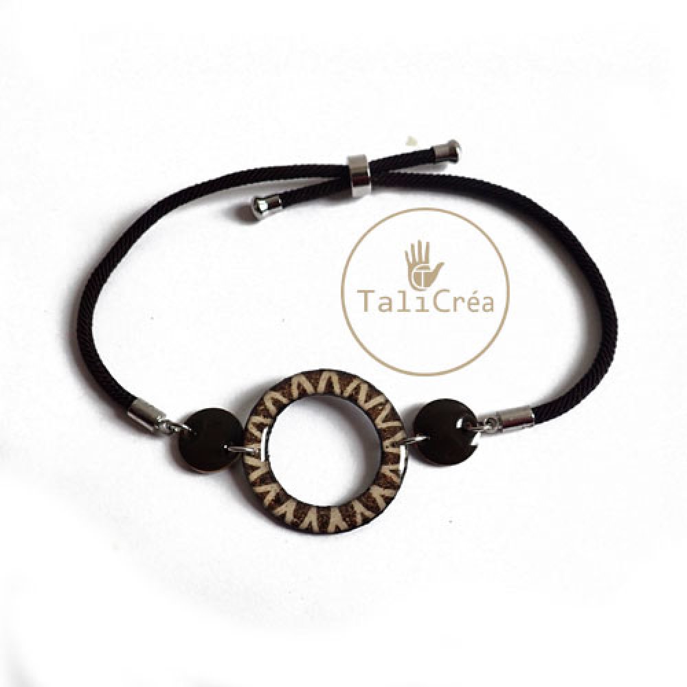 Un bracelet en cordon réglable marron foncé/argenté avec émail marron et cercle en sable marron et ivoire.