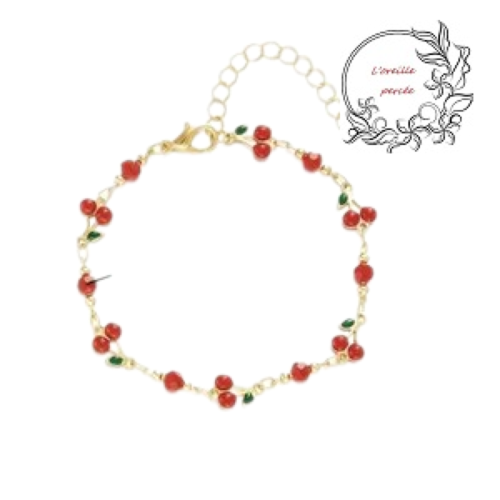 Joli bracelet réaliser avec ses 7 connecteurs en émail "cerise" et ses petites perles rouges et perles dorées.