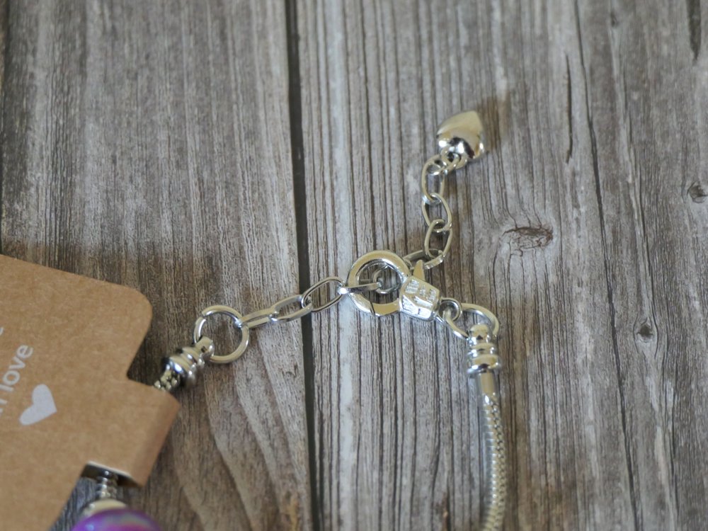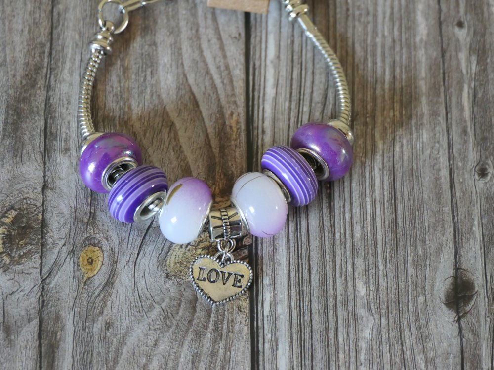 Ce bracelet élégant est composé d’une chaîne serpent ajustable (16 cm + 5 cm de rallonge) et orné de magnifiques perles européennes en verre et résine, accompagnées de perles d'espacement en alliage de zinc (sans nickel). Le bracelet est sublimé par un pendentif cœur argenté "Love" qui lui donne une touche romantique.
